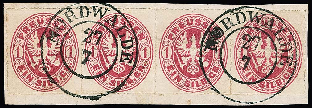 "Nordwalde", klarer, paarweise aufgesetzter besserer vorphil. Westfalen-K2 auf dekor. Briefstück mit Viererstreifen Wappen 1 Sgr. (re. Marke winziger Eckbug)