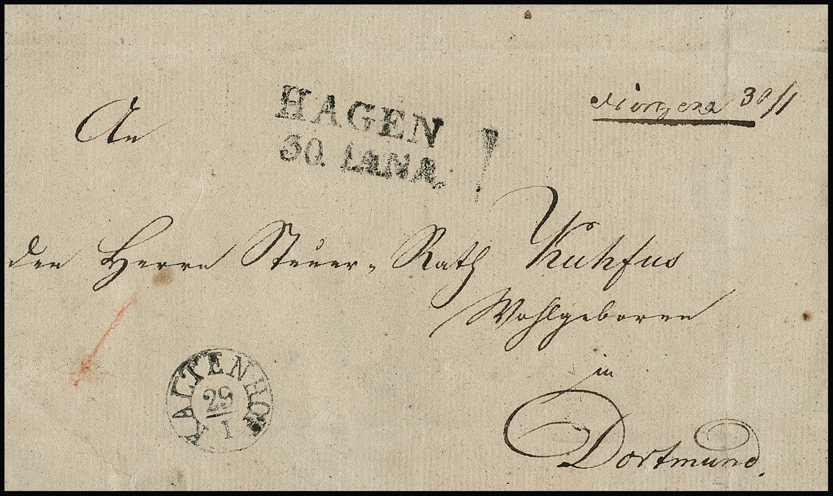 "Nirgena", (1829), seltene handschriftliche Aufgabe der Briefsammlung vom 30.11., nebst kleinem Fingerhut-K1 "Kaltenhof" (Chausseegeldstelle bei Gevelsberg v. 29.11.) sowie L2 "Hamm", auf Briefhülle nach Dortmund. Sehr ungewöhnliche Kombination von diesem seltenen, nur kurz geöffneten Postort