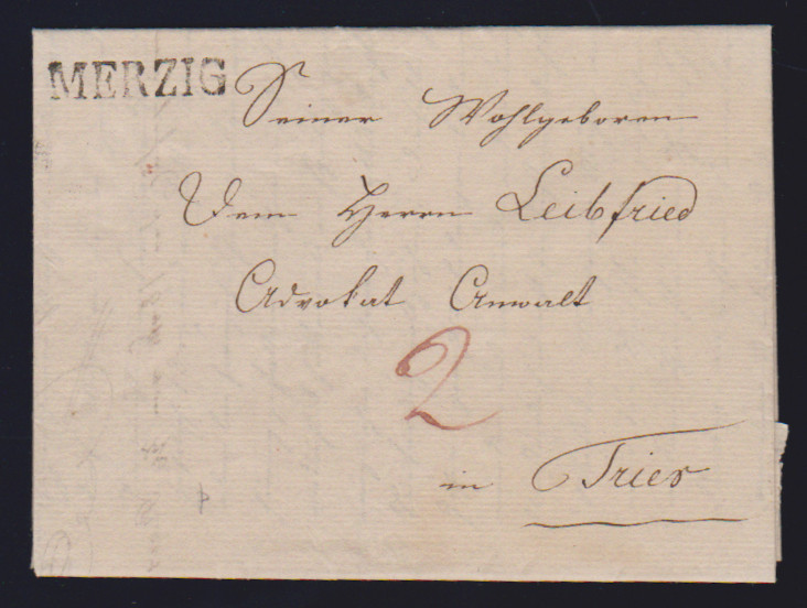 "Merzig", 1825, 3.2., klarer L1 auf Luxusbrief nach Trier