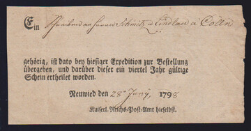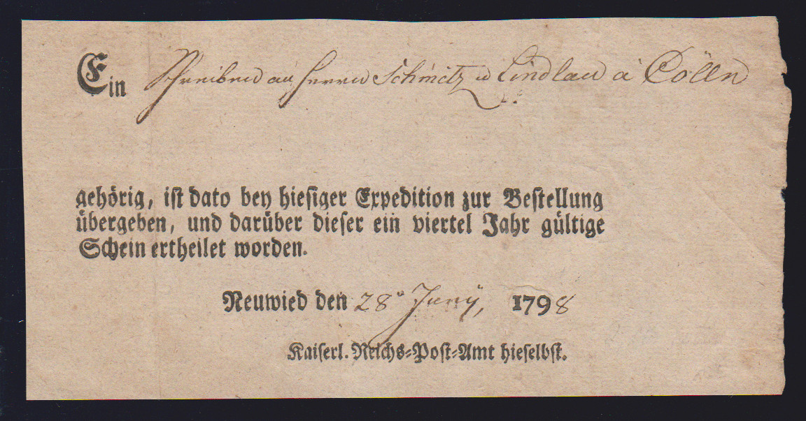 "Neuwied", 1798, "Kaiserl. Reichs-Post-Amt hieselbst", seltener Ortsdruck-Postschein