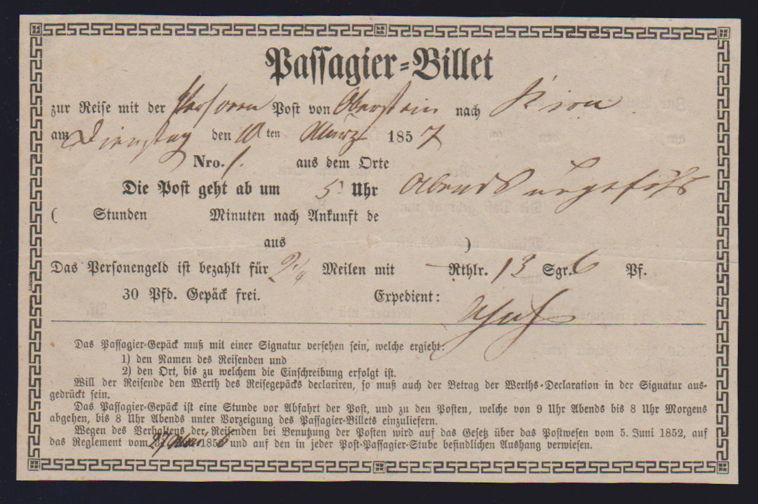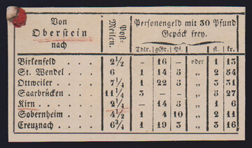 "Oberstein-Kirn", 1857, seltenes Passagier-Billet mit Zierrahmen, dazu ein kleiner Aushang mit den Tarifen der Linie Oberstein