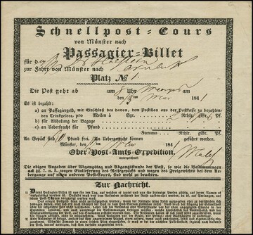 "Münster", 1841, dekor. Post-Reise-Schein für eine Fahrt mit der Schnellpost von Münster nach Rheine (Passagiergeld 2 Rth., 17 Ggr. und 6 Pfge.)