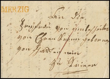 "Merzig", 1819, orangegelber L1 klar auf Kabinettbrief nach Trier (aus Bintzen)