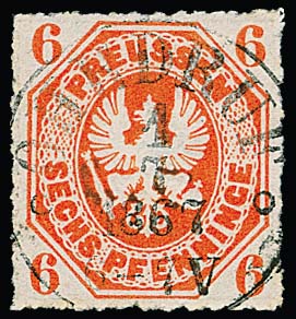 6 Pfge. orange, Kabinettstück mit zentrischem nachverwendetem Taxis-K1 "Ohrdruf" vom 1.7.1867, dem Ersttag der Verwendung preußischer Marken im ehemaligen Taxisgebiet