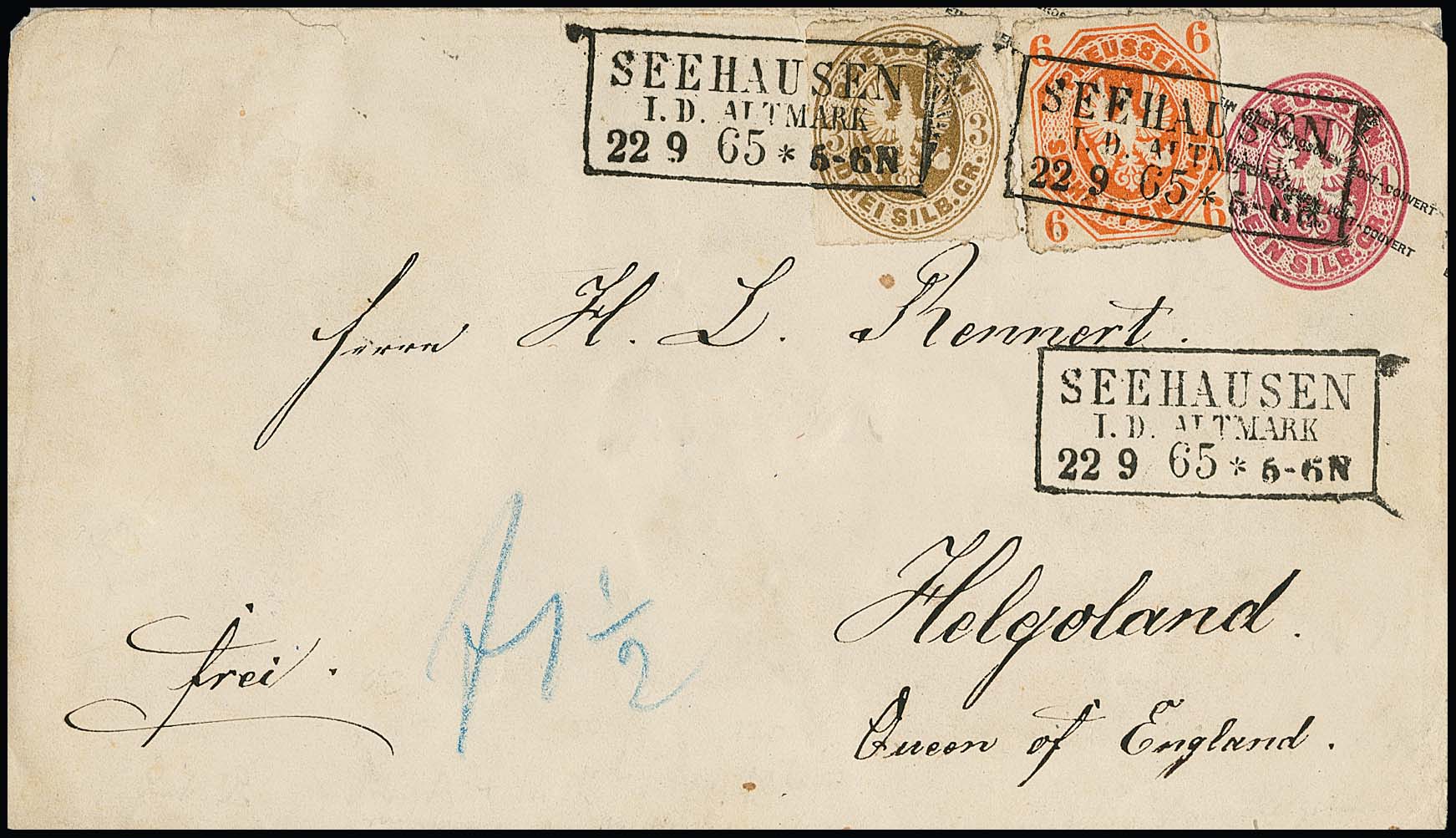 6 Pfge. rotorange und 3 Sgr. ockerbraun auf Ganzsache 1 Sgr. rosa, mit Ra3 "Seehausen i.d. Altmark" 1865 nach Helgoland gelaufen. Porto 3 Sgr. bis zur Grenze und 1 1/2 Sgr. Weiterfranko, kleine Durchstich-Unebenheiten, ursprüngliche Gebrauchserhaltung