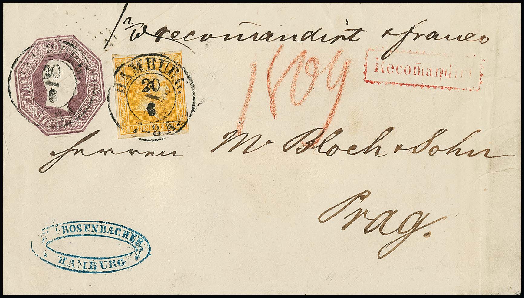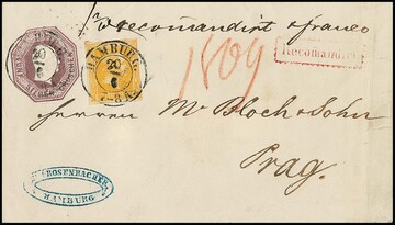 3 Sgr. orangegelb, perfektes Exemplar auf Oktogon-Ganzsache 5 Sgr. purpur (diese rückseitig ein Klappenteil nicht vollständig), mit K2 "Hamburg" als doppelt schwerer eingeschriebener Postvereinsbrief nach Prag, Attest Brettl