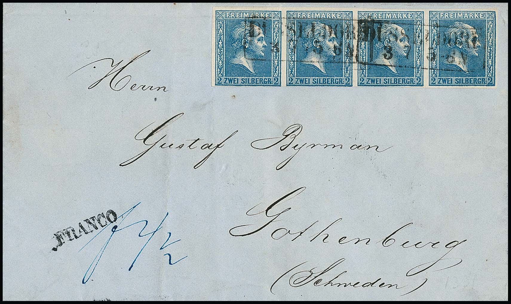 2 Sgr. blau, waagerechter, allseits voll- bis breitrandiger Viererstreifen auf Auslandsbrief mit Ra2 "Düsseldorf" nach Gothenburg/Schweden 1860. Die dritte Marke mit einer ganz winzigen Papierrunzel (belanglos und im Attest nicht erwähnt, der dort beschriebene leichte Knitter rührt vom Briefinhalt her und ist kein Mangel). Ein dekorativer Schwedenbrief mit seltenem Streifen aus der Spahrkäs-Sammlung, Attest Flemming, zuletzt 100. Feuser (4000,- Euro!)