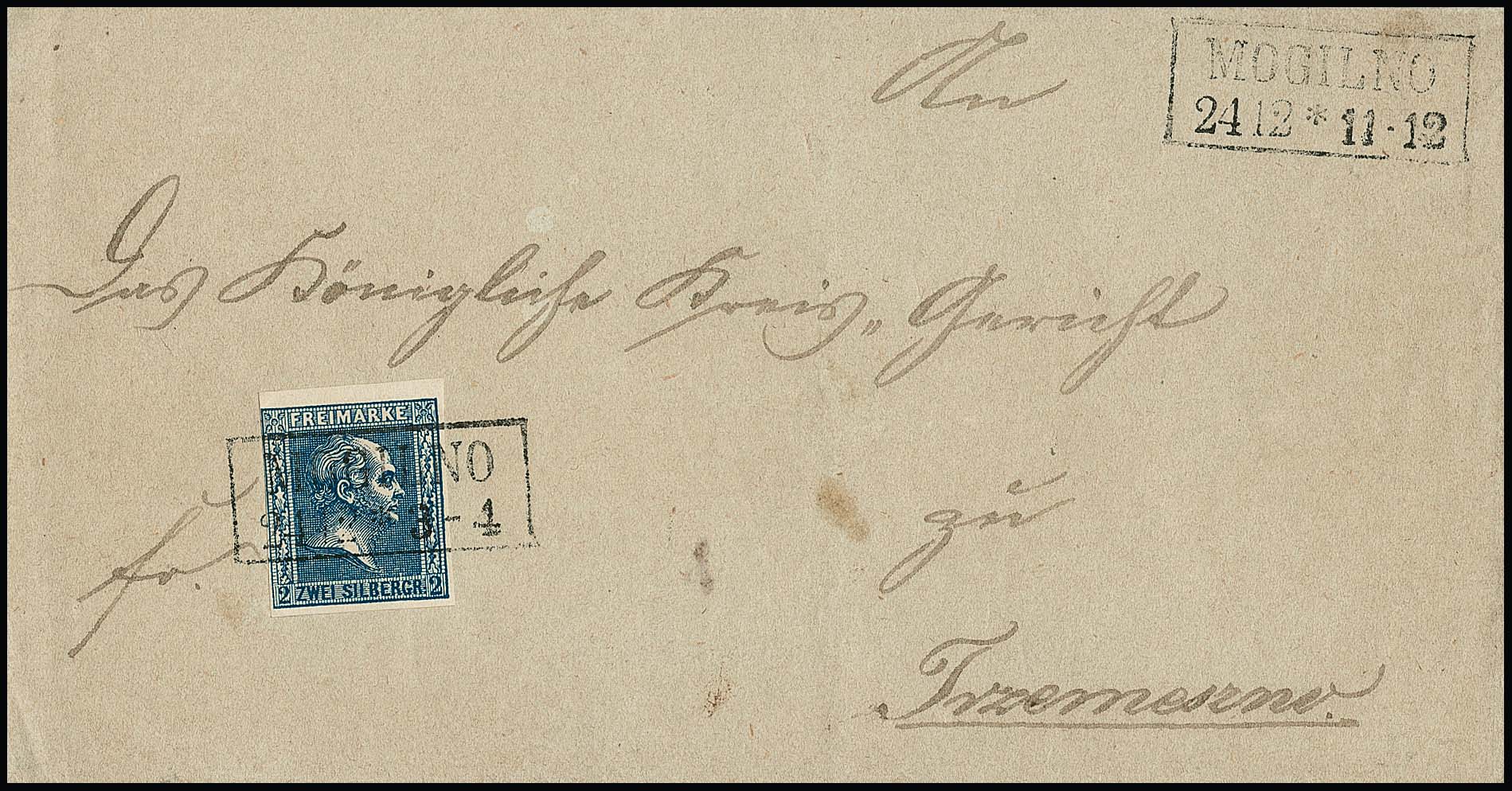 2 Sgr. schwarzblau, tiefe und typische Farbe, allseits voll- bis breitrandig, auf Kabinettbrief mit geradem Ra2 "Mogilno" nach Trzemeszno. Die Marke zeigt den Plattenfehler "heller Punkt in der rechten Rosette" (Handbuch G2). Mi. 2000,- + PF, sign. Banker, Starauschek und Attest Wasels