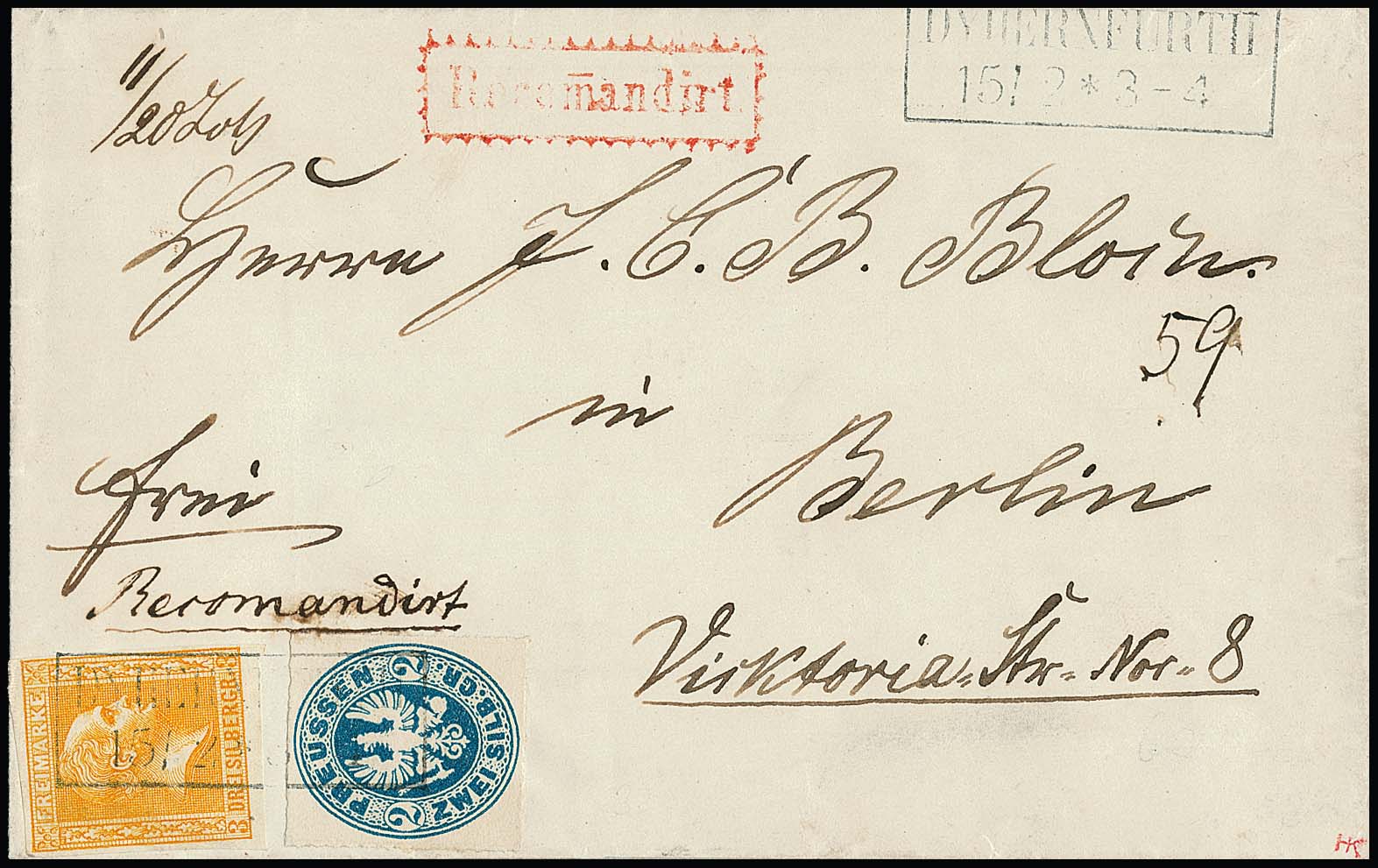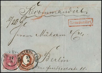 3 Sgr. orange, allseits voll- bis breitrandig, in Mischfrankatur mit Wappen 2 Sgr. preußischblau auf prachtvollem Einschreibebrief mit Ra2 "Dyhernfurt" nach Berlin. Seltene Kombination mit der "Preußischblauen". Ex Weise (Zuschlag 1988 DM 940,- für Kurt Metzer), sign. Banker, Krause, Metzer