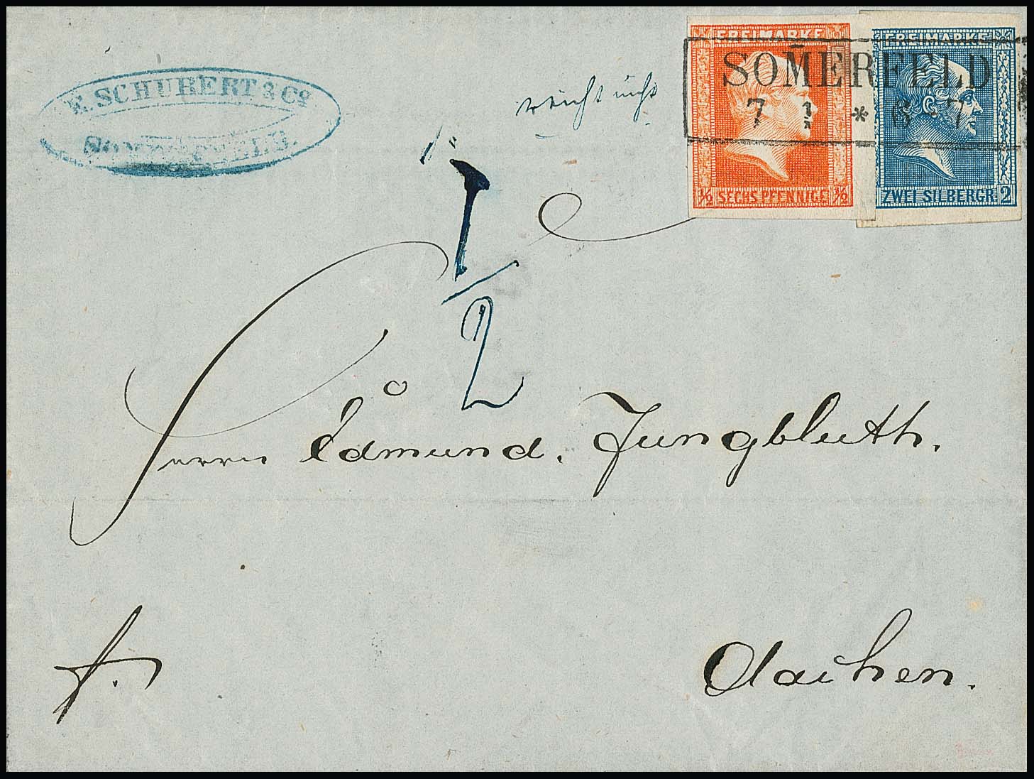 2 Sgr. blau und 1/2 Sgr. ziegelrot, beide meist sehr breitrandig, auf schön gestempeltem Kabinettbrief mit idealem Ra2 "Sommerfeld" 1862 nach Aachen. Unter den Marken befindet sich nur im Briefpapier eine Druckstelle. Das Porto betrug 3 Sgr., hs. "reicht nicht" und die fehlenden 1/2 Sgr. vom Empfänger erhoben. Ein dekorativer Brief, sign. Flemming, Banker
