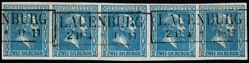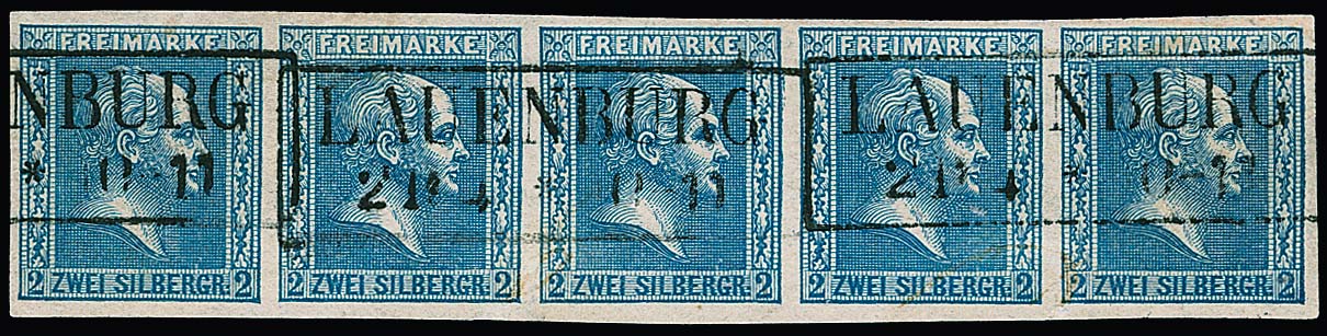 2 Sgr. blau, breitrandiger Kabinett-Fünferstreifen mit Ra2 "Lauenburg". Von dieser Marke seltener Streifen! Bei uns registriert seit der 166. Balasse-Auktion 1958, danach u.a. Slg. Spahrkäs. Attest Flemming
