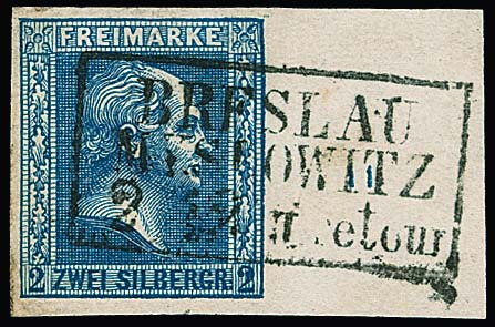 2 Sgr. blau, breitrandiges Kabinettstück mit rechts 17mm Bogenrand (nur im Rand Vorfaltspur) mit Reihenzahl "11" und vollem Bahnpost-Ra3 "Breslau-Myslowitz retour". Marke von Feld 110 mit Plattenfehler "dicke 2 rechts" (Handbuch E2). Fotoexp. Wasels
