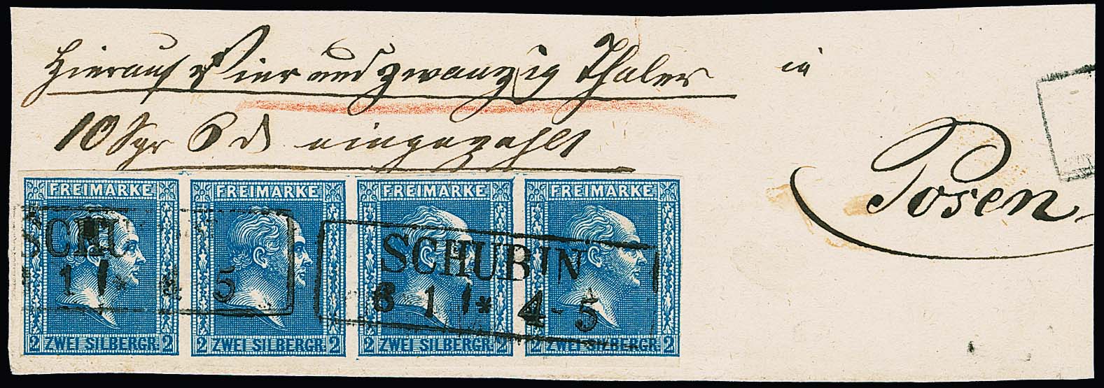 2 Sgr. blau, waagerechter Pracht-Viererstreifen (rechts unten etwas "Lupenrand") auf großem Postanweisungsbriefstück mit Ra2 "Schubin". Eine seltene Einheit aus der Burrus-Sammlung. Mi. 1200,-