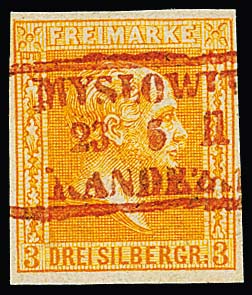 3 Sgr. gelborange, Kabinettstück mit hierauf seltener Entwertung durch roten Bahnpost-Ra3 "Myslowitz-Kandrzin" sehr klar