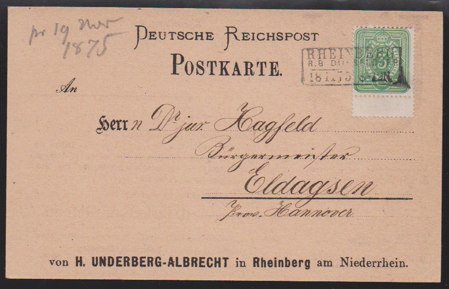 4 Pfge. grün, perfektes Exemplar mit blauem Hannover-K2 "Salzderhelden" (erster Monat, 16.10.1866) auf rosa Vordruck-Streifband (Inhalt nachträglich zur Dekoration) an den bekannten und auch heute noch existierenden Schnapshersteller "Underberg" in Rheinberg. Dazu eine Werbekarte um 1870 von Underberg, sowie eine dekorative Drucksachenkarte 1875 mit 3 Pfge. grün (mit Zw.) von Underberg, sign. Petry. Eine schöne Dokumentation!