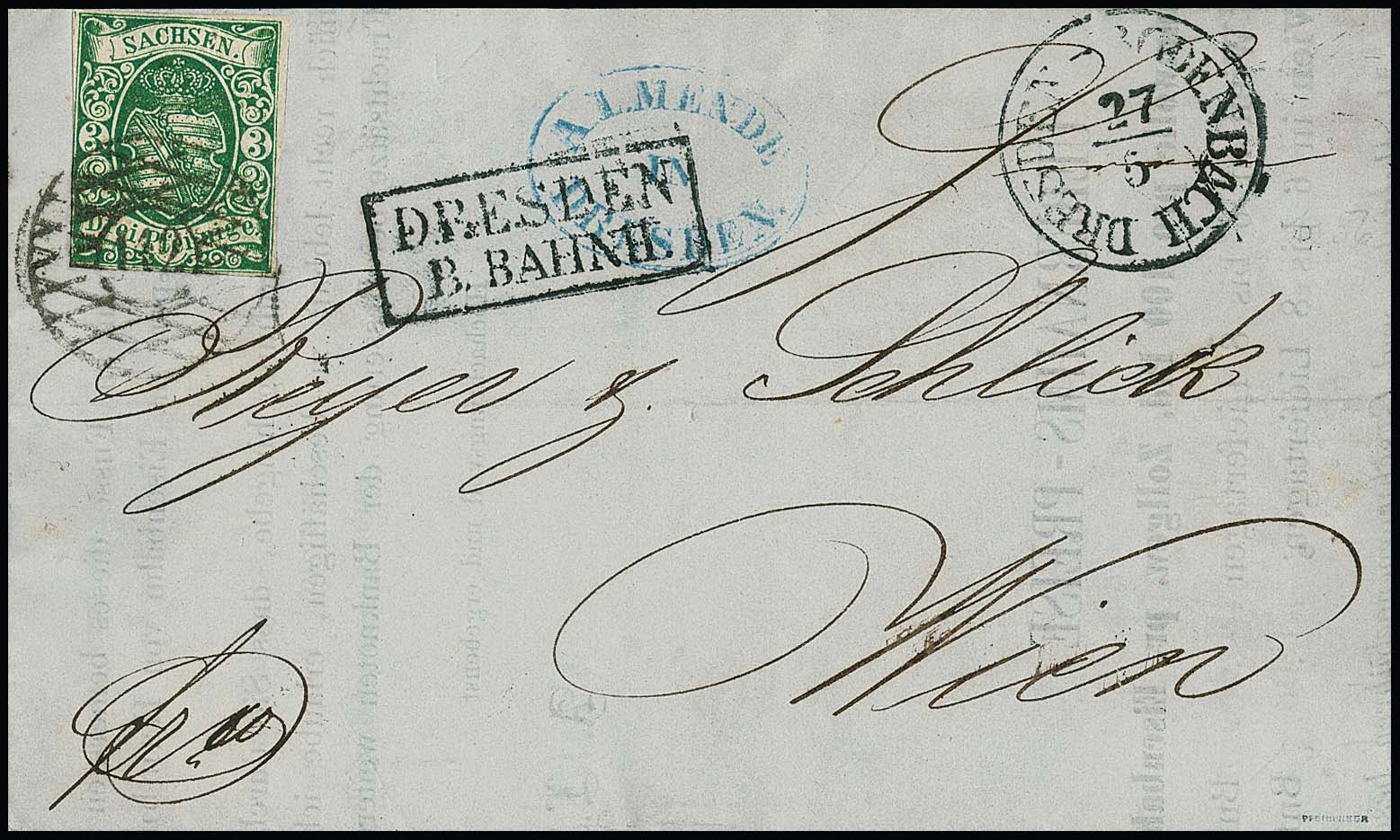 3 Pfge. blaugrün, weitgehend vollrandig, auf Bahnpost-Drucksache mit besserem NS "112" sowie Ra2 "Dresden B. Bahnh." und Bahnpost-K1 "Dresden-Bodenbach" 1856 nach Wien, sign. Pfenninger. Mi. 350,- + Feuser 300,- für den Stempel