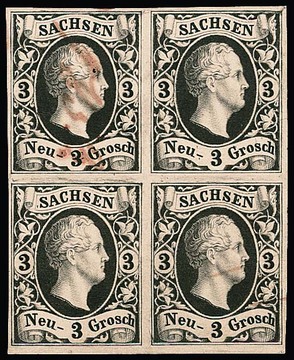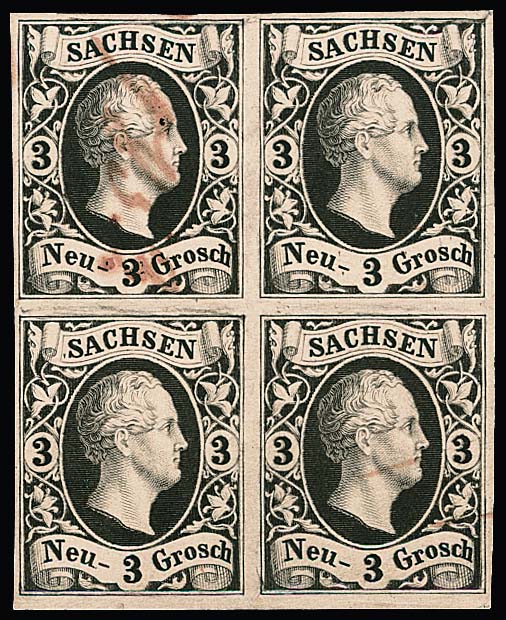 2 Ngr. schw./dunkelblau, allseits breitrandiger ungebrauchter Luxus-Achterblock ohne Gummi, wahrscheinlich ein Vorlagestück aus den Aktenbeständen. Es handelt sich um die größte bekannte ungebrauchte Einheit der Friedrich-August-Ausgabe überhaupt und um ein literatur-bekanntes Unikat (Sachsen-Handbuch von J. Herbst, S. 140), ex Sammlungen Burrus und Knapp. Maurice Burrus ersteigerte den vorliegenden Block auf der 29. Stock-Auktion 1927, neben weiteren ungebrauchten Großeinheiten, als ein Ministeriums-Archiv aufgelöst wurde. Attest Vaatz "einwandfrei ... Unikat" (zwei Falz-Viererstreifen werten schon nach Michel 15.000,-!). Foto siehe Innentitel