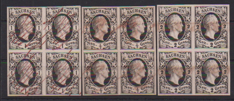 1/2 bis 3 Ngr. schwarz auf weißem Kartonpapier, vier Pracht-Viererblocks mit Annullationsstrichen