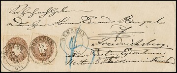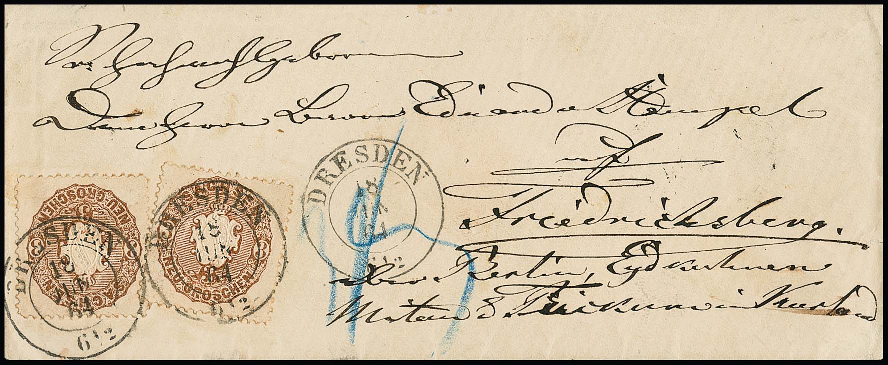 3 Ngr. gelblichbraun per zwei auf Prachtcouvert mit K2 "Dresden" 1864 nach Kurland/Rußland, Fotoexp. Rismondo