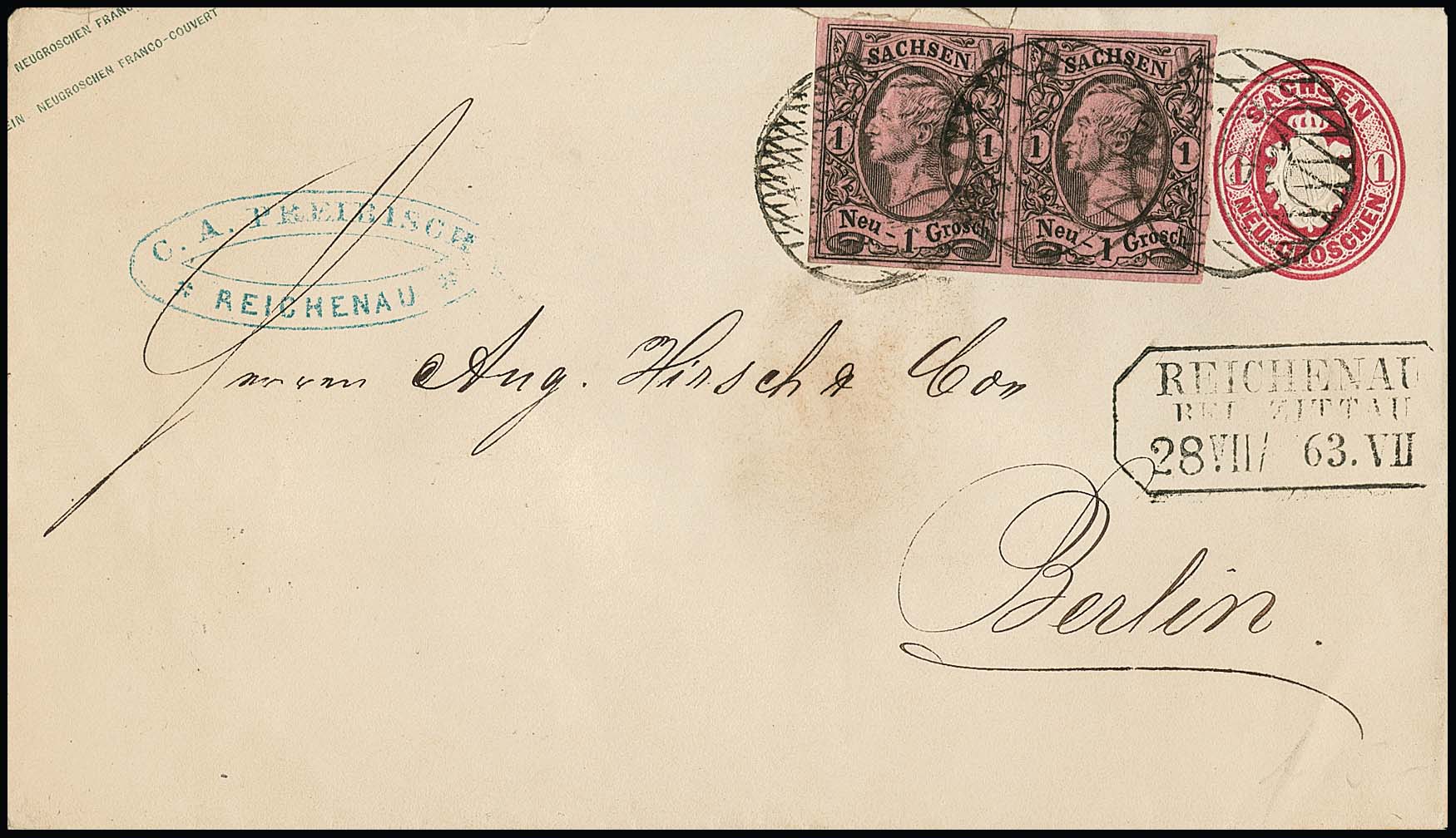 "164" nebst Ra2 "Reichenau bei Zittau" auf Wappen-Ganzsache 1 Ngr. (oben kl. Öffnungsmgl.) mit Prachtpaar Johann 1 Ngr.