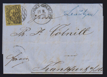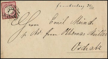 "7" (Bahnpost Hainichen-Chemnitz) klar nachverwendet, nebst handschriftlicher Aufgabe "Frankenberg", auf Couvert mit 1 Gr. rosa, großes Brustschild (ein verkürzter Zahn). Attest Krug