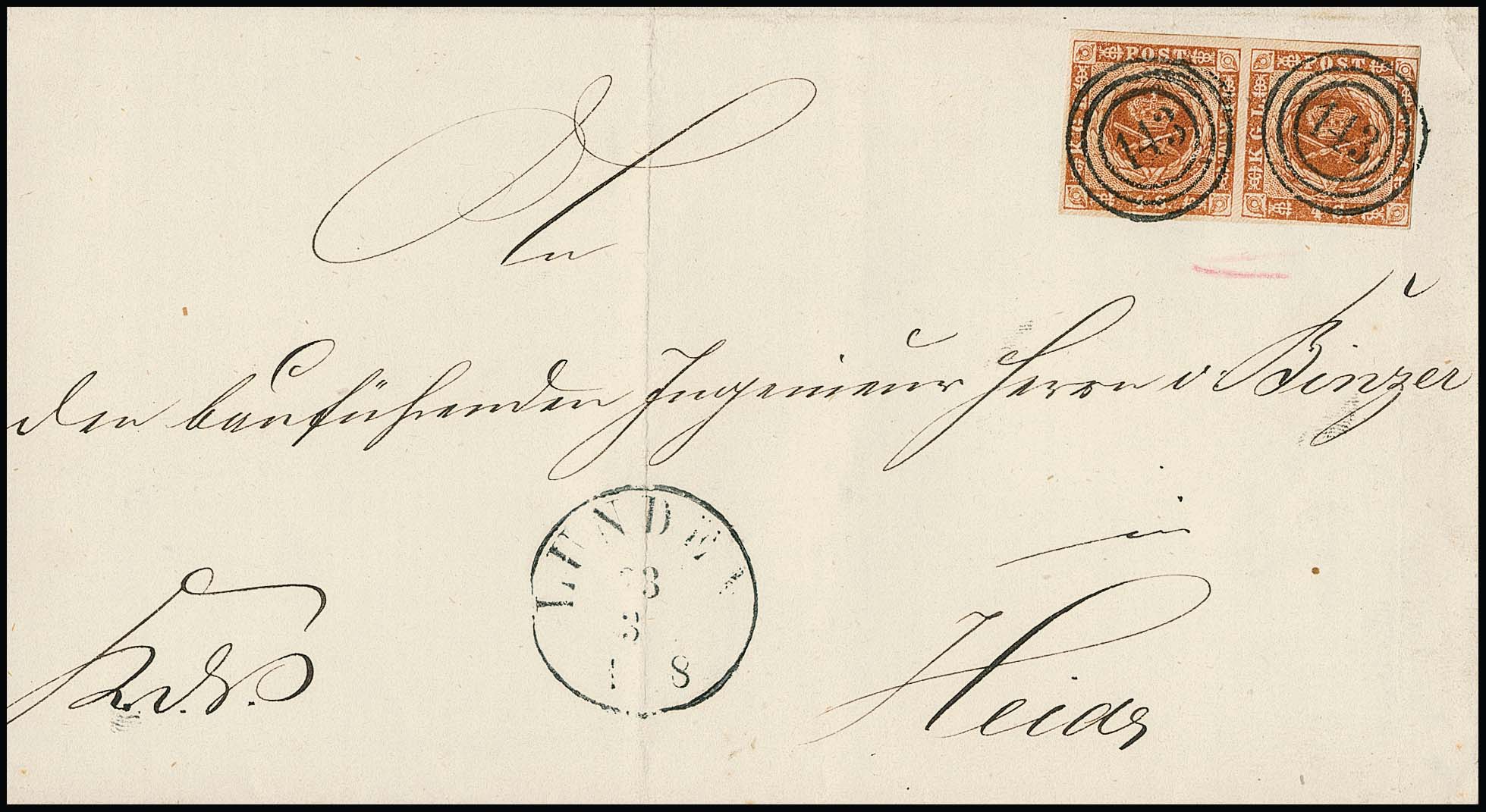 "143" nebst K1 "Lunden" auf Faltbrief mit Kabinettpaar Dänemark 4 Sk.