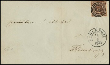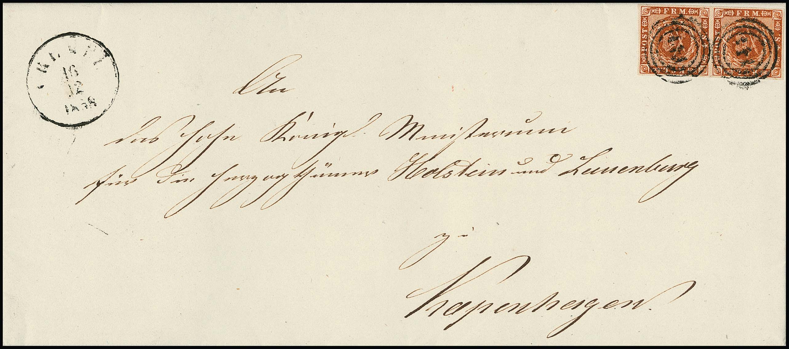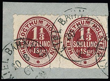 1 1/3 Sch. rot im Paar auf Kabinettbriefstück mit K1 "Kiel Bahnhof", sign. Müller-Mark. Mi. 200,-