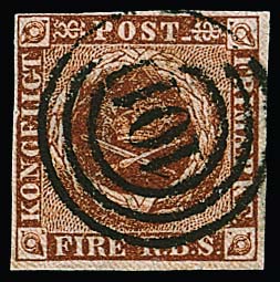 "101" (Gravenstein) klar auf Prachtstück Dänemark "FIRE R.B.S." in der seltenen kastanienbraunen Nuance (natürliche Sandkornpore), Attest Möller "sehr selten"
