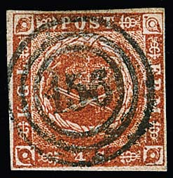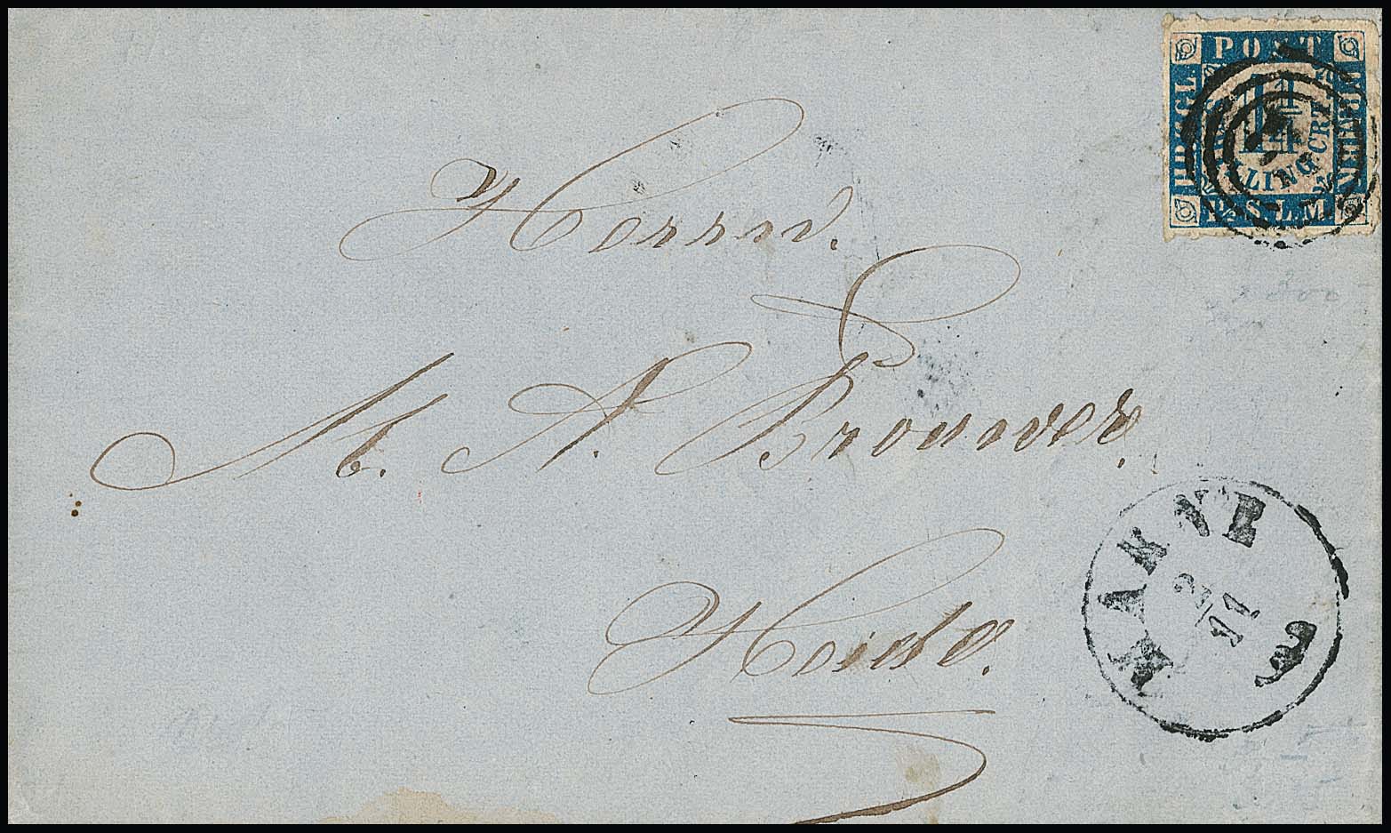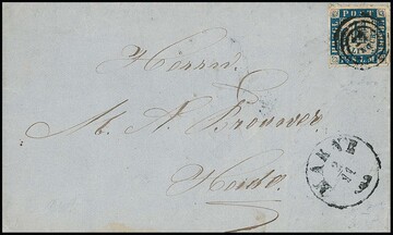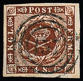 "156" (Hanerau, Landpost Nr. 2) zentr. auf Kabinettstück Dänemark 4 Sk., sign. Krause
