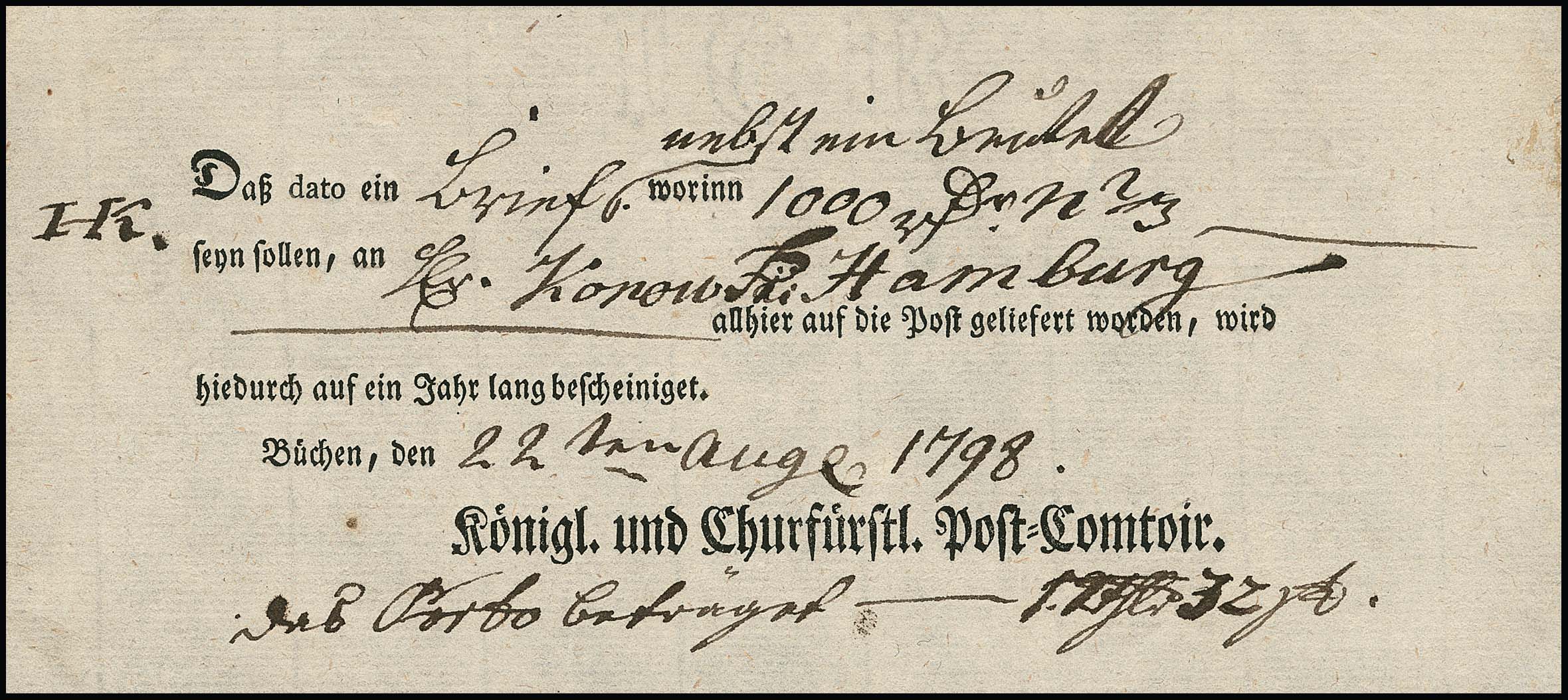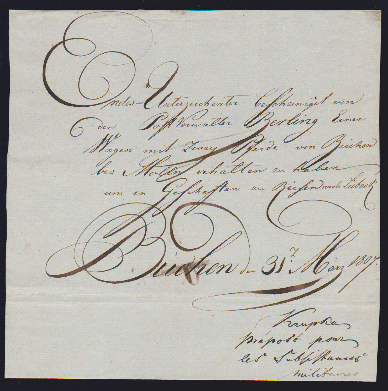 "Büchen", 1807, handschriftliche Bescheinigung des Postverwalters Berlin über den Erhalt eines Postwagens mit zwei Pferden