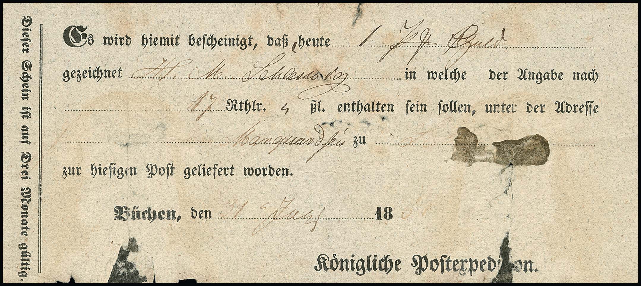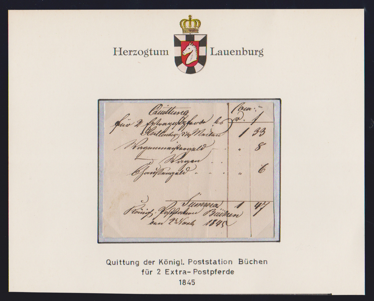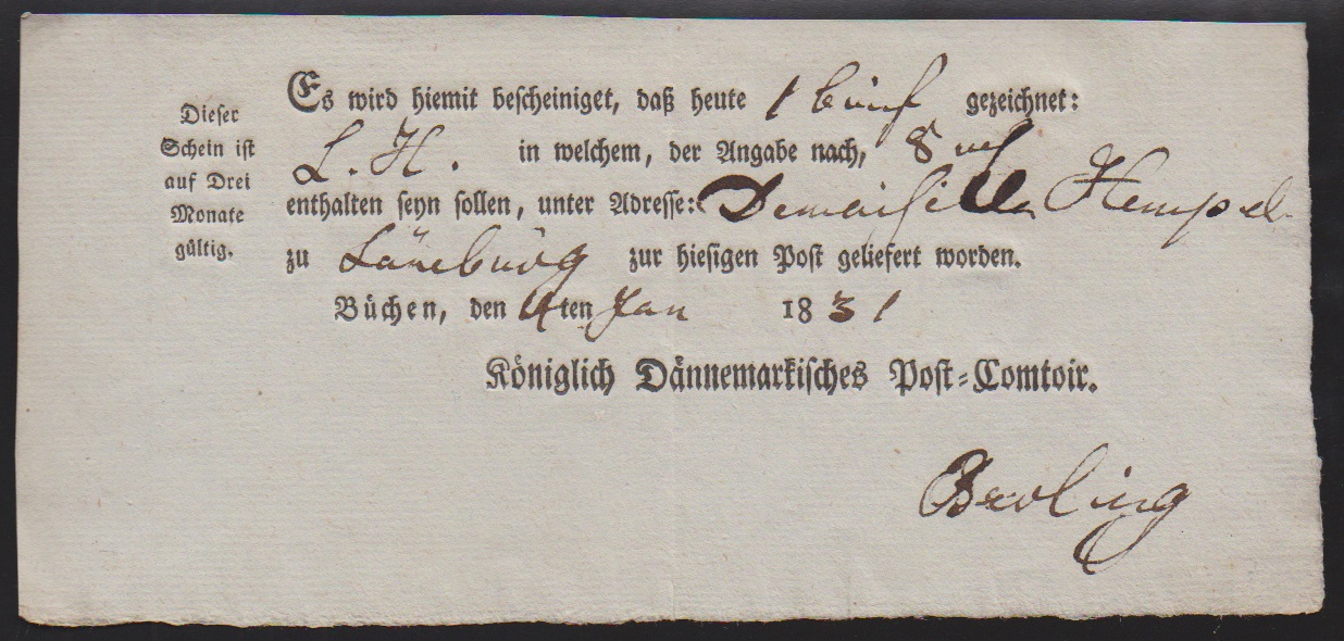 "Büchen", 1845, kleine handschriftliche Extra-Post-Quittung über zwei Pferde bis Artlenburg