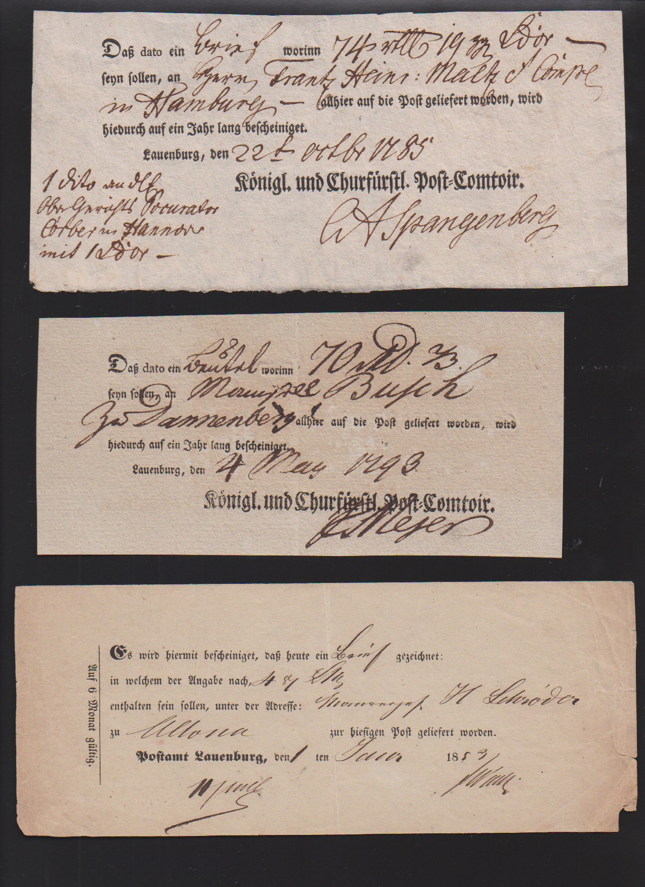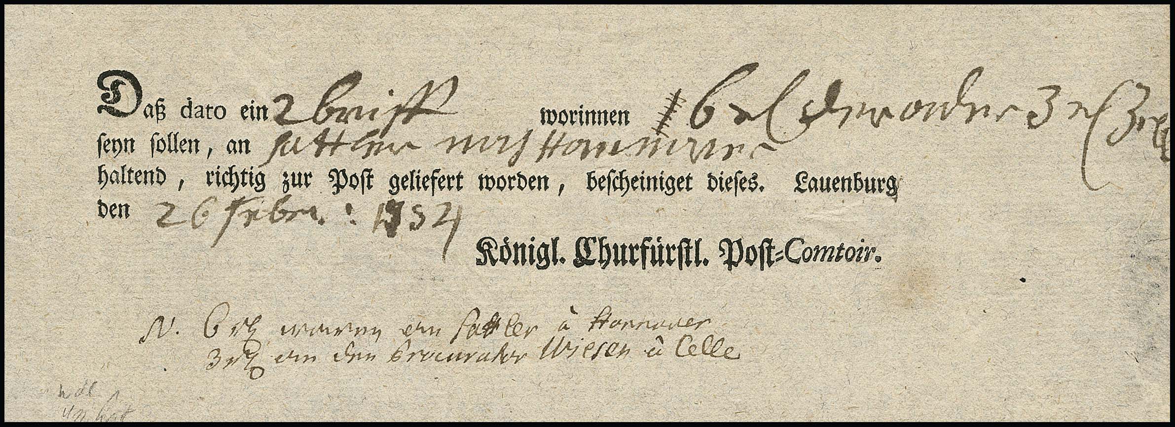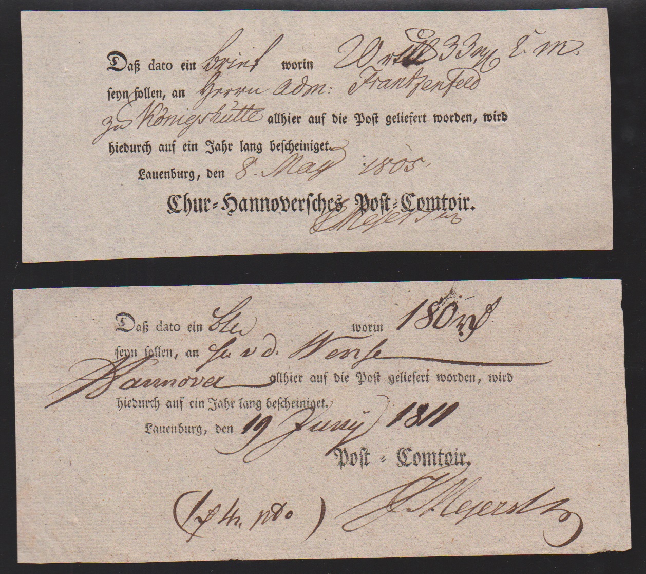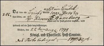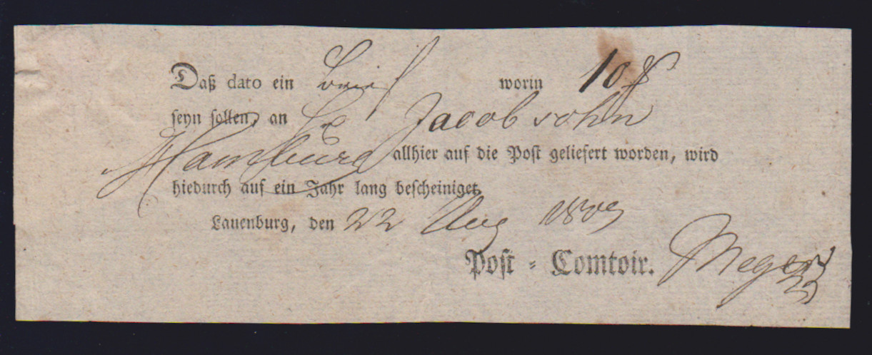 "Lauenburg", 1778, handschriftlicher Postschein, sowie 1787 "Königl. Churfürstl. Post-Comtoir J.C. Meyer", große hs. Einlieferungsquittung für acht (!) Wertsendungen nach Altona, Hamburg und Schwerin