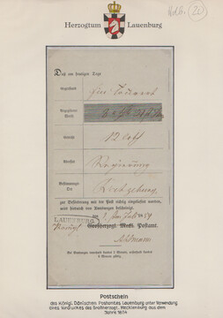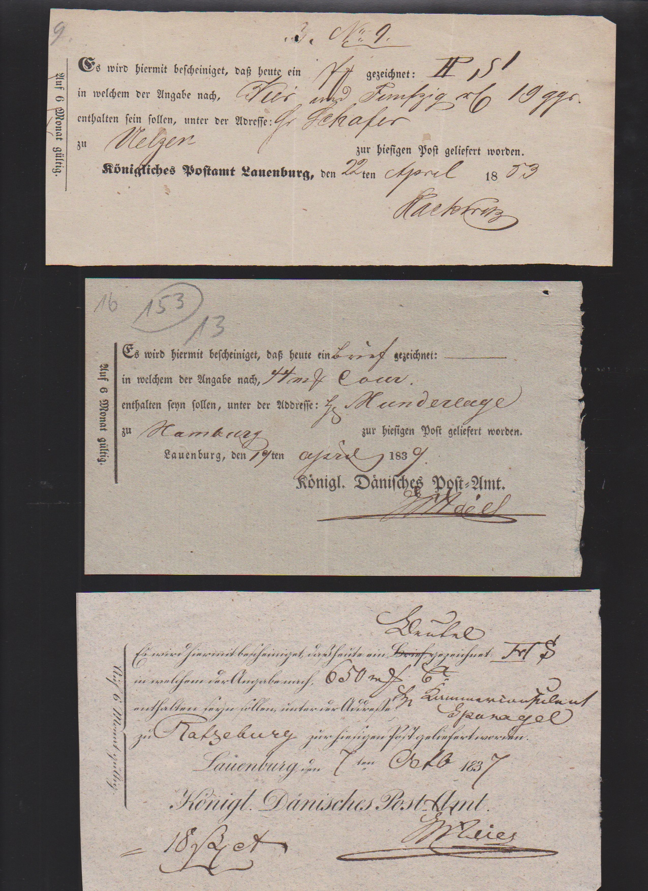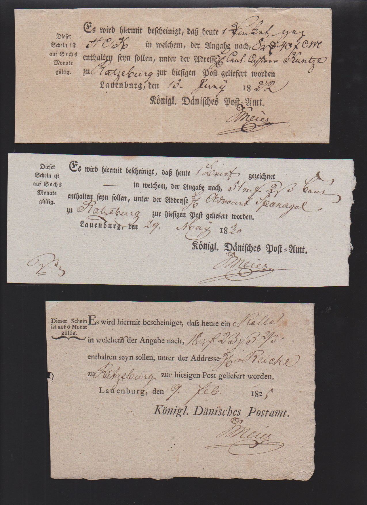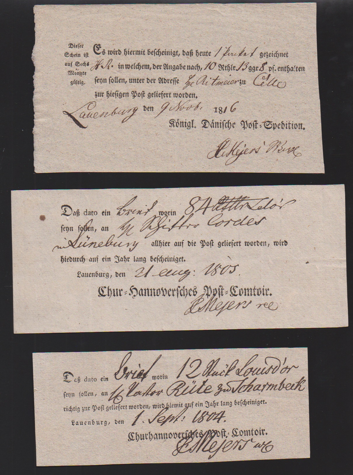 "Lauenburg", 1778, handschriftlicher Postschein, sowie 1787 "Königl. Churfürstl. Post-Comtoir J.C. Meyer", große hs. Einlieferungsquittung für acht (!) Wertsendungen nach Altona, Hamburg und Schwerin