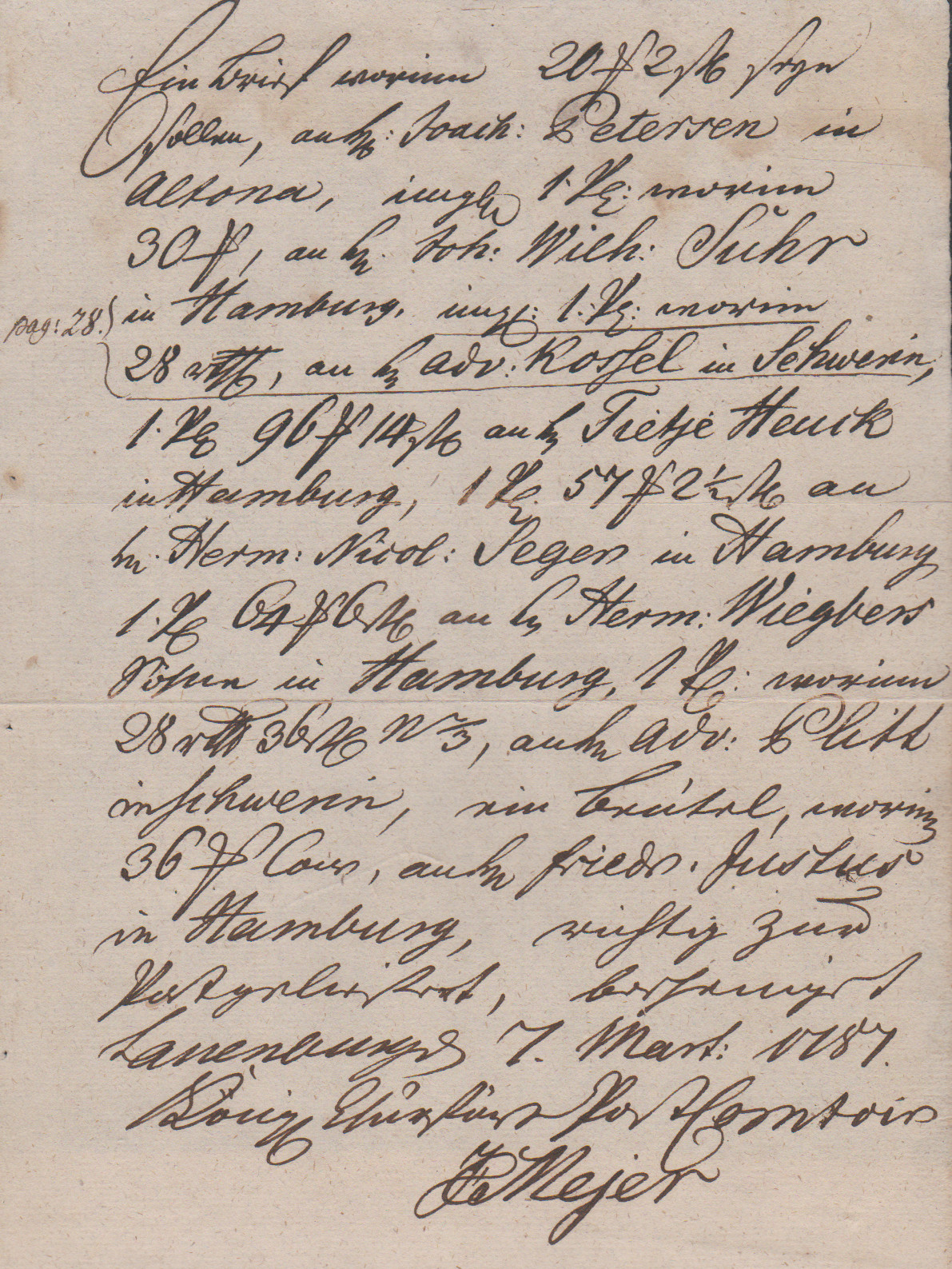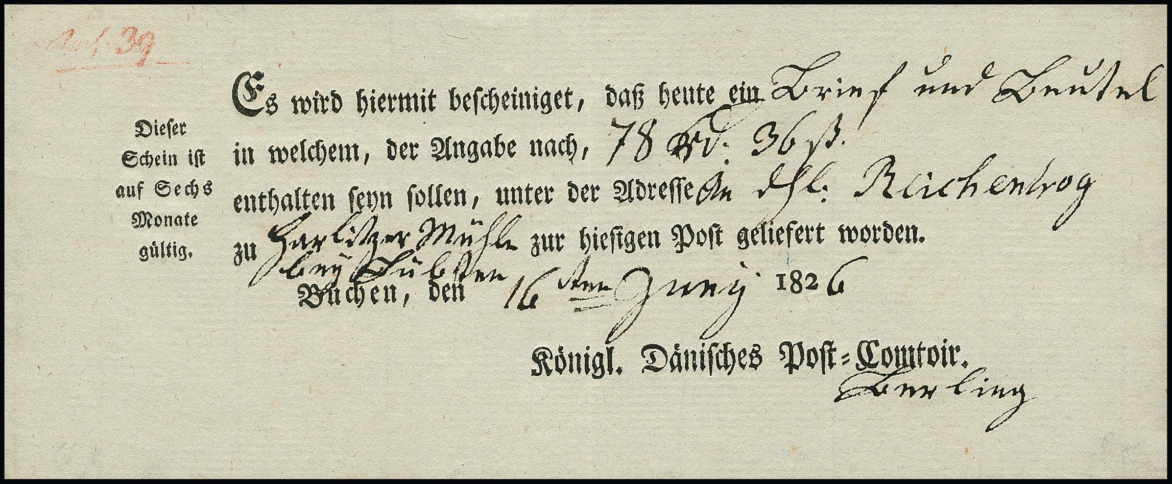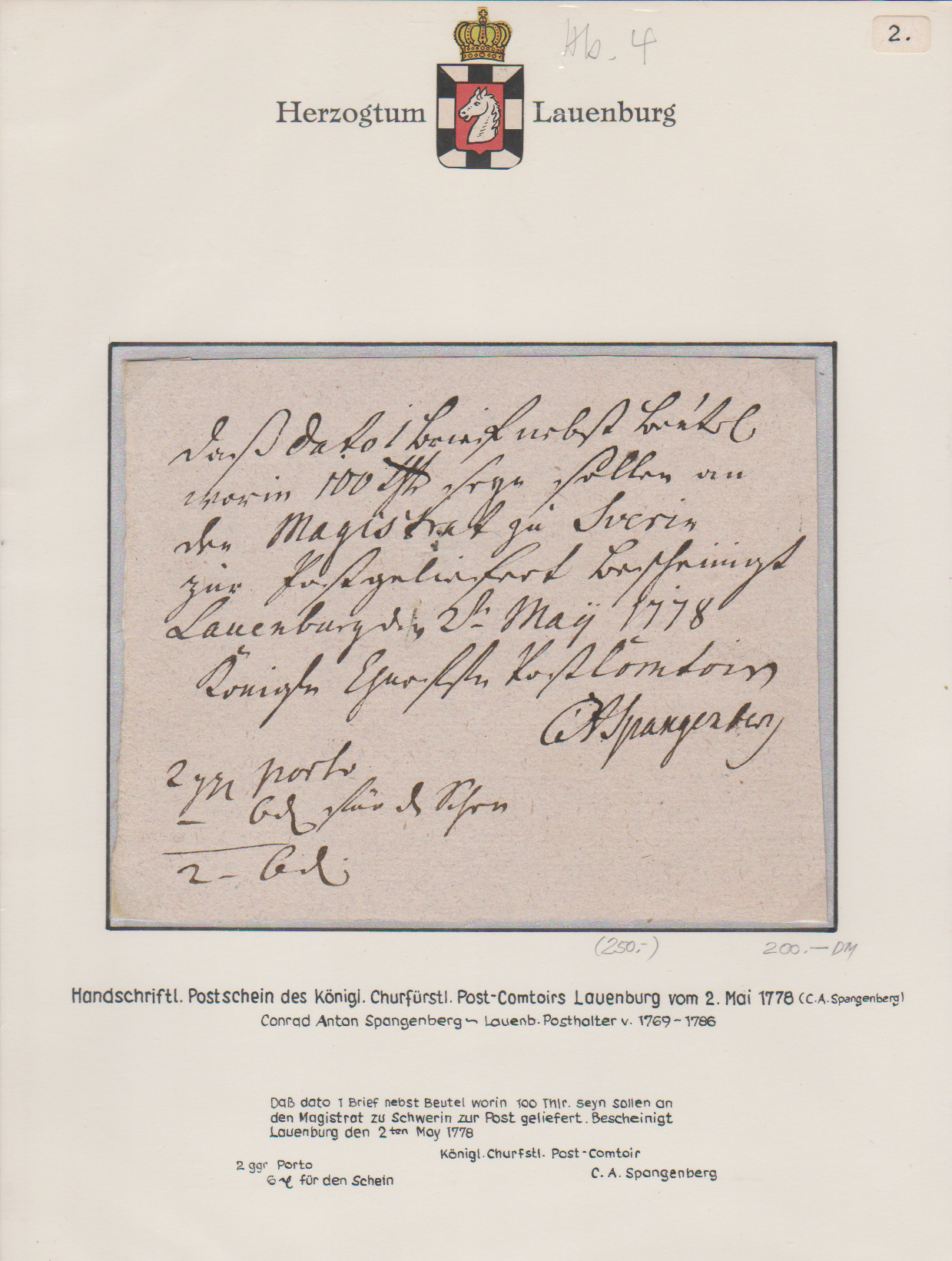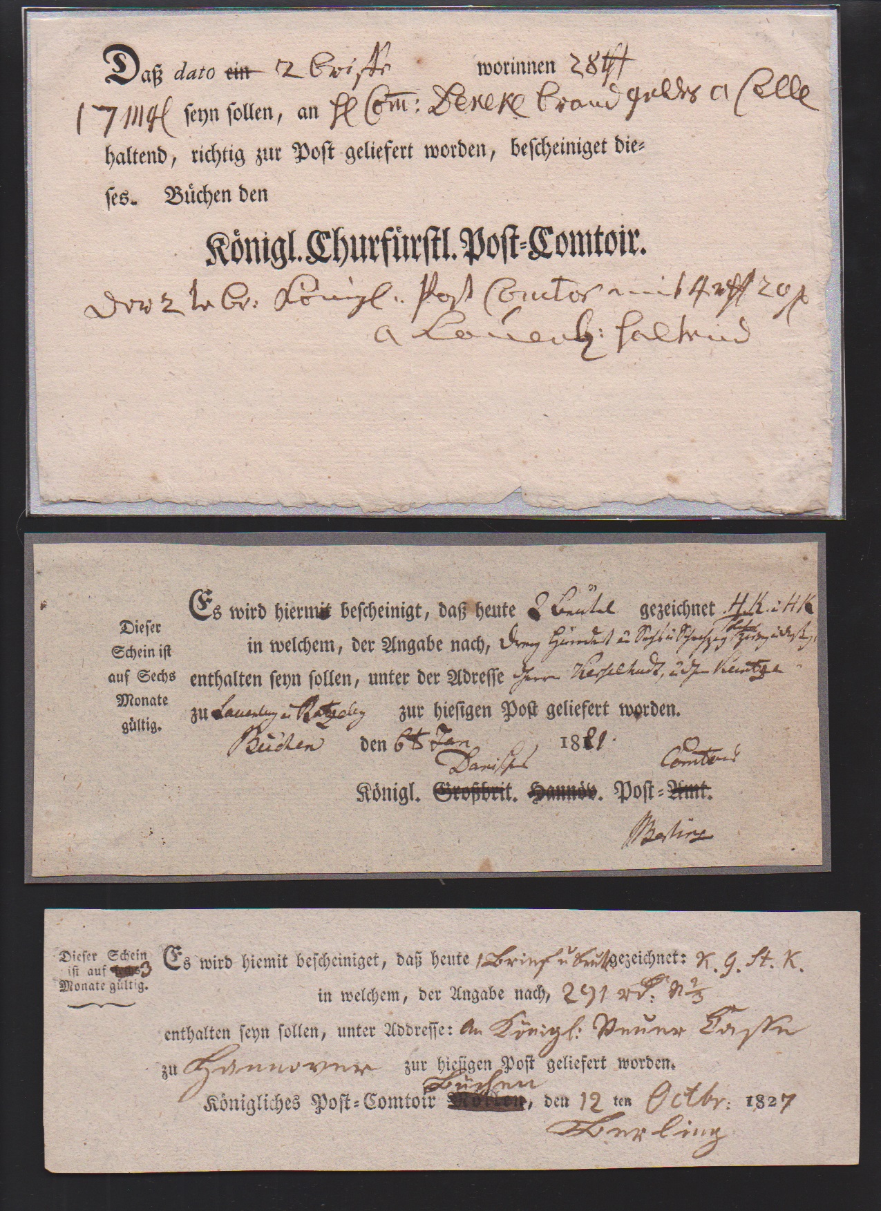 "Lauenburg", 1778, handschriftlicher Postschein, sowie 1787 "Königl. Churfürstl. Post-Comtoir J.C. Meyer", große hs. Einlieferungsquittung für acht (!) Wertsendungen nach Altona, Hamburg und Schwerin