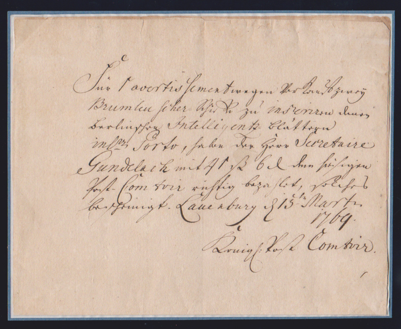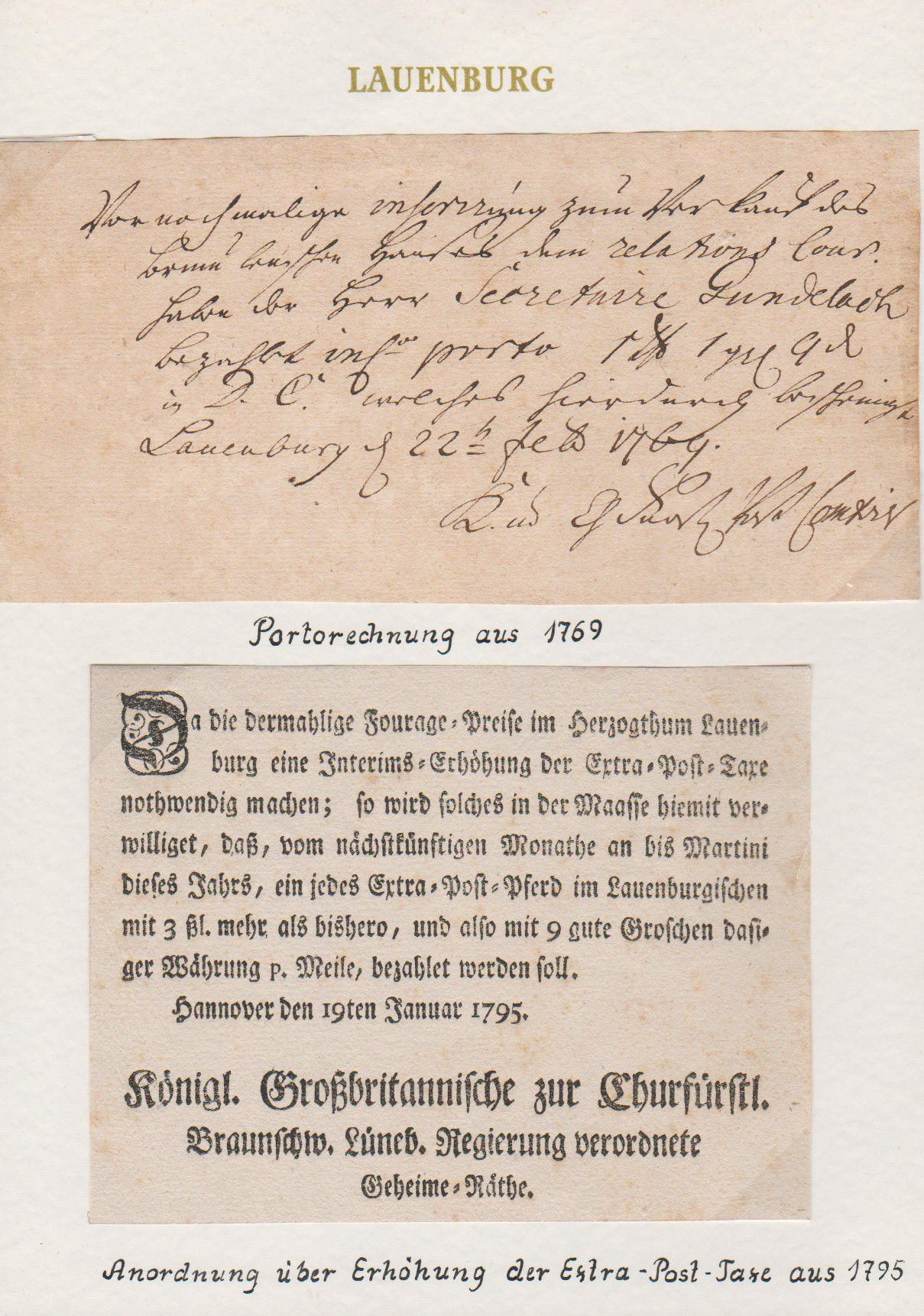 "Lauenburg", 1777, hs. Postschein ("königl. Postcomtoir"), sowie hs. Portorechnung aus 1769