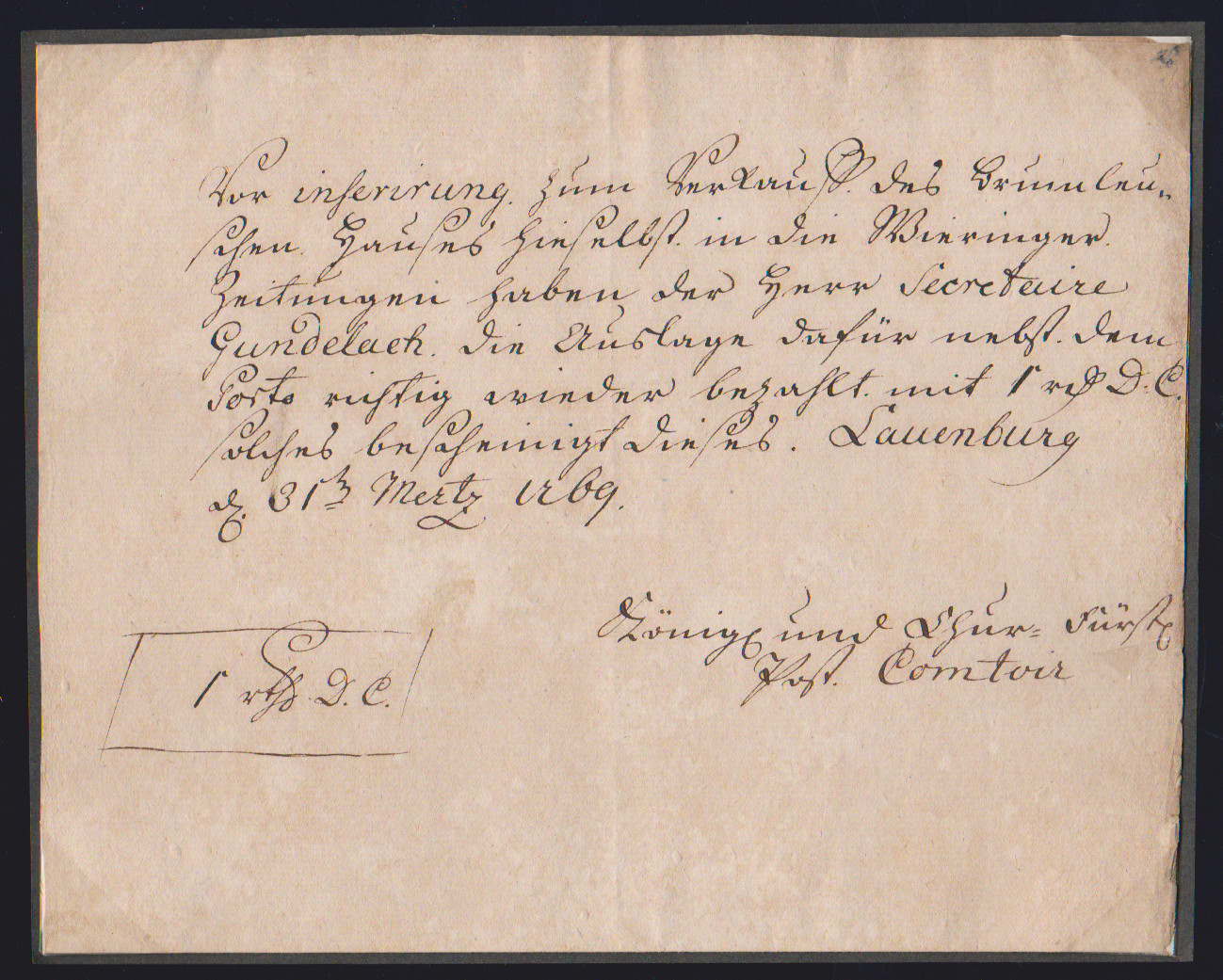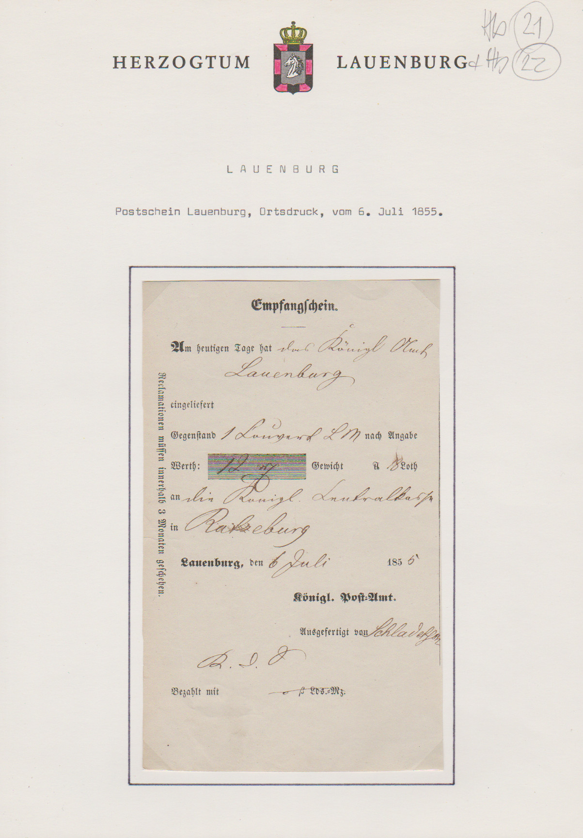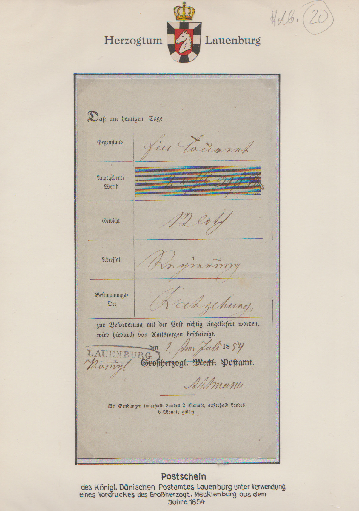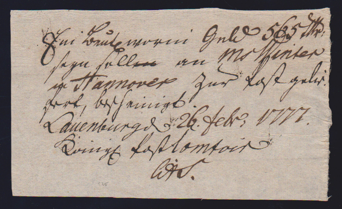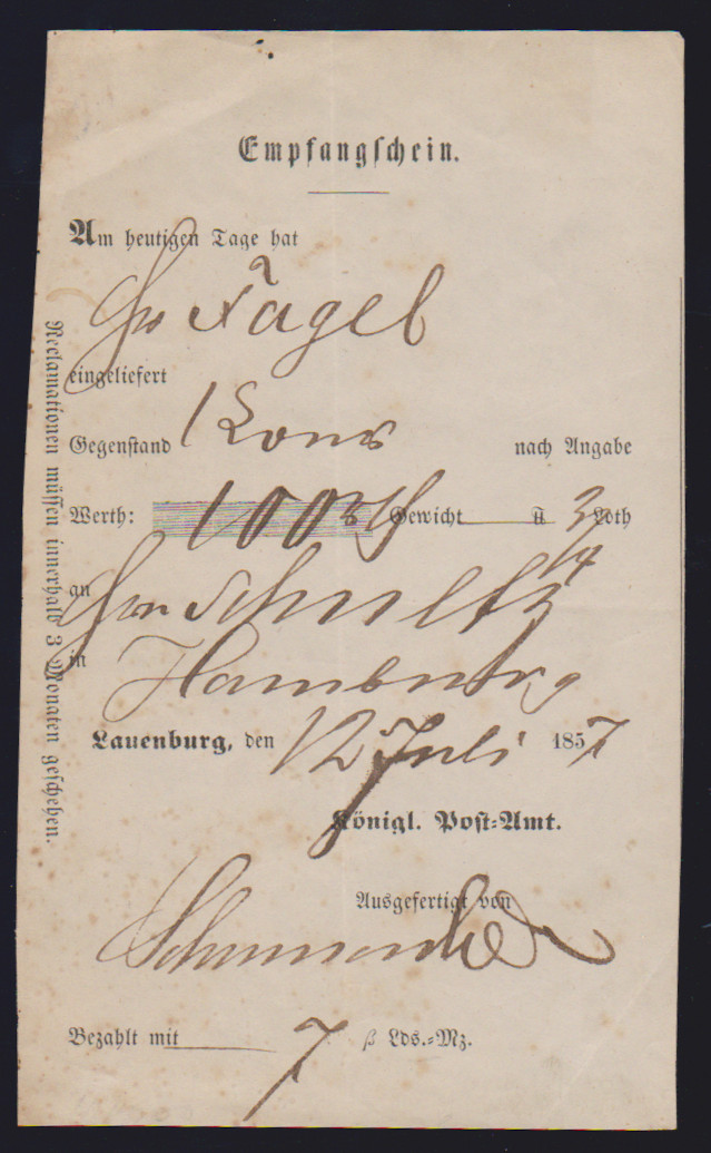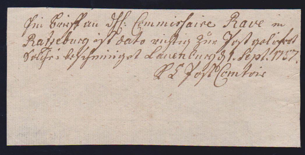 "Lauenburg", 1757, seltener früher handschriftlicher Postschein