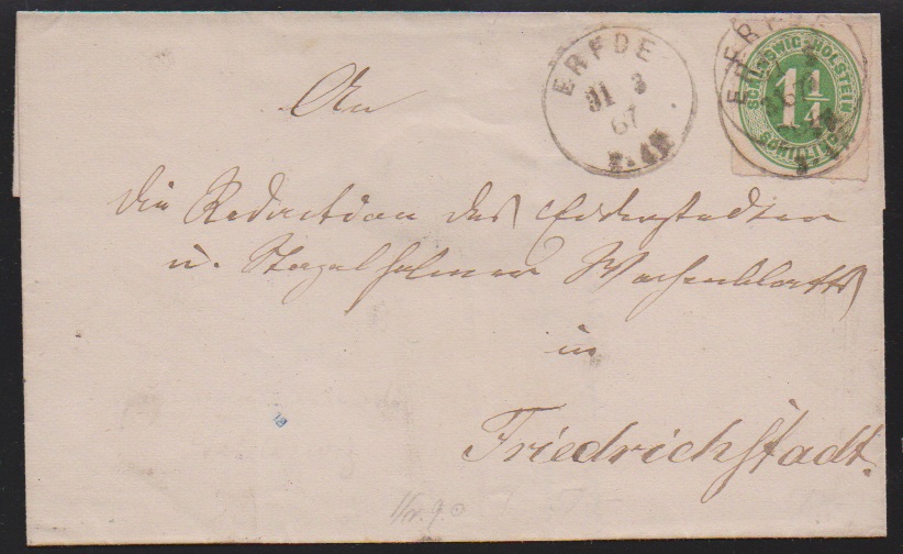 "Erfde", besserer neuer K1 klar zweimal auf Brief mit 1 1/4 Sch.