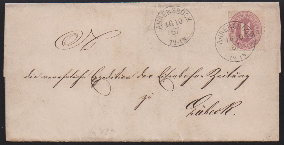 "Ahrensböck", klarer Grotesk-K1 1867 auf Brief 1 1/4 Sch. purpur (natürliche Aufkleberunzel) nach Lübeck