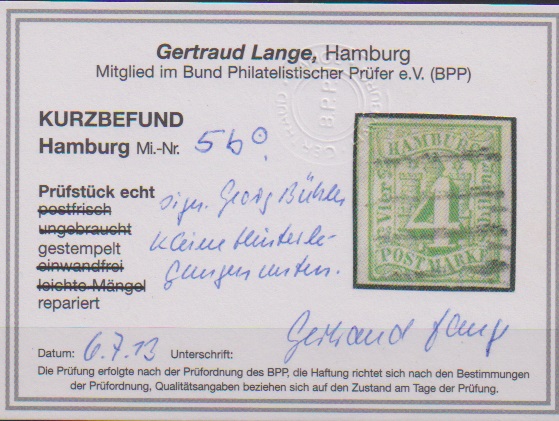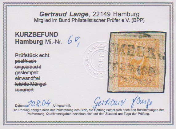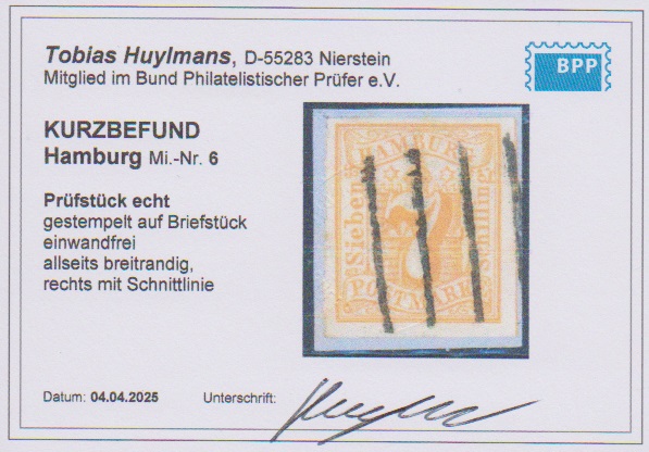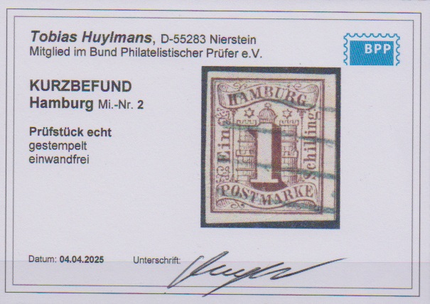 1 Sch. braun, gestempeltes Kabinettstück mit gut sichtbarem Plattenfehler "Punkt zwischen M und B von HAMBURG", sign. Starauschek. Mi. 600,-