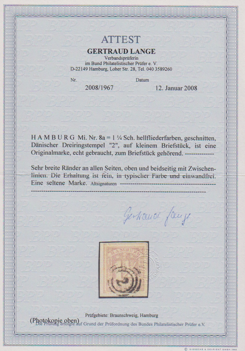 1 1/4 Sch. hellflieder, gute Farbe, allseits sehr breitrandig auf Kabinettbriefstück mit NS "2", sign. Bloch und Attest Lange. Mi. 1200,-