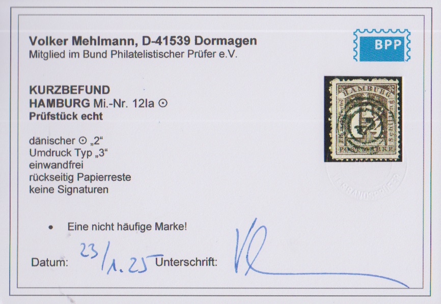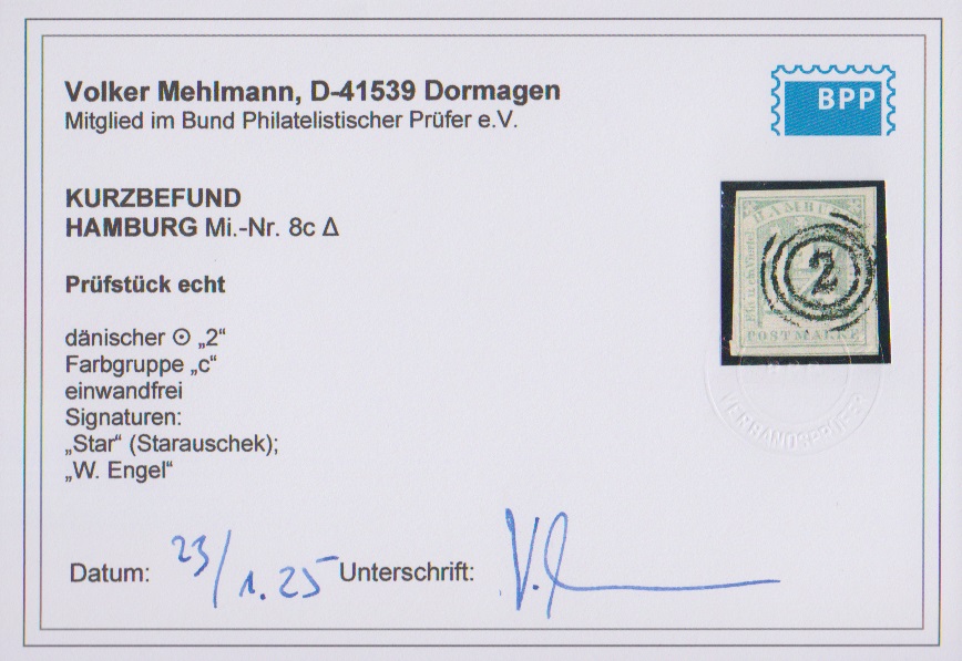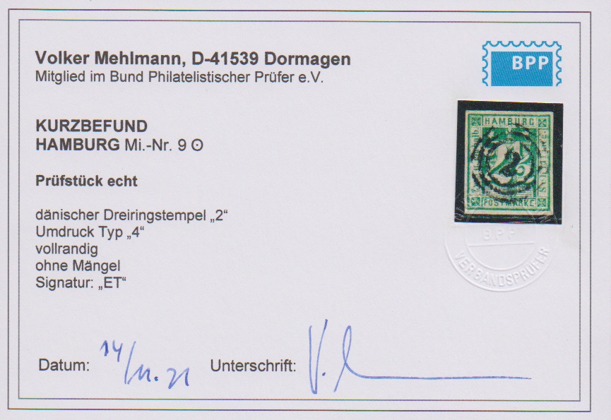 2 1/2 Sch. blaugrün, Kabinettstück mit zentrischem dänischem NS "2", Fotoexp. Mehlmann. Mi. 180,-