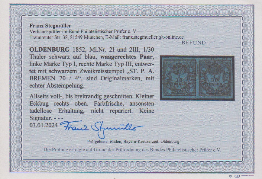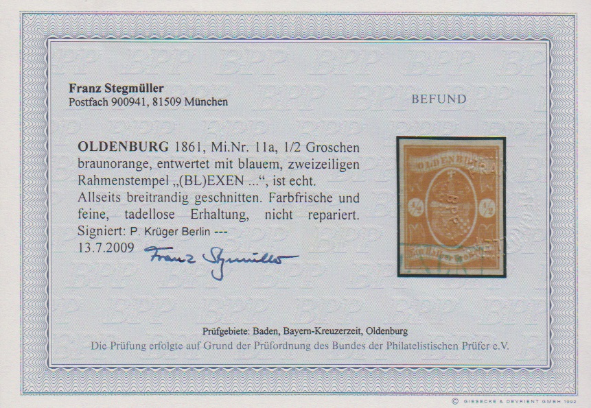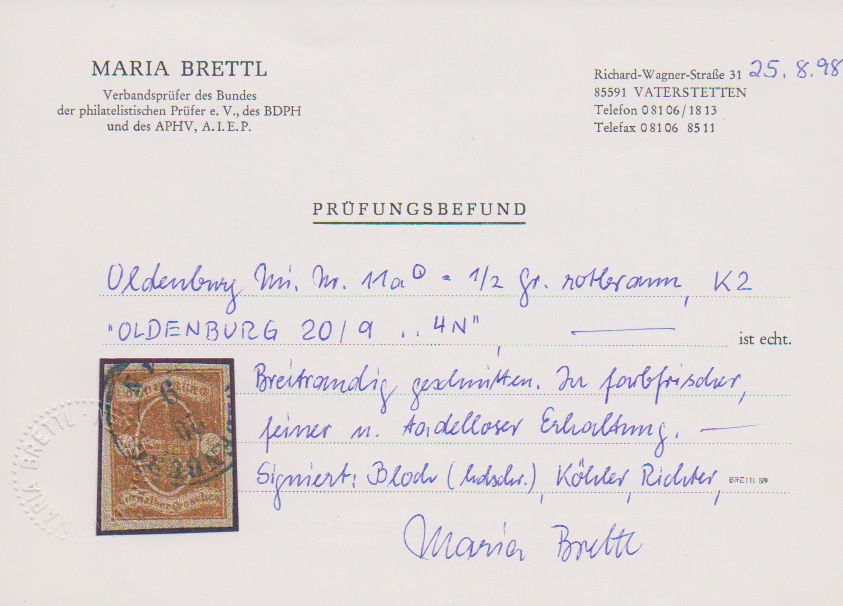 1/2 Gr. rotbraun, breitrandiges Kabinettstück mit K2 "Oldenburg", sign. Bloch, Köhler und Brettl mit Fotoexpertise. Mi. 650,-