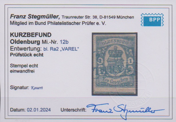 1 Gr. trübblau, überrandiges Kabinettstück mit Ra2 "Varel", unten Nebenmarke, sign. Kauert und Fotoexp. Stegmüller. Mi. 320,- +