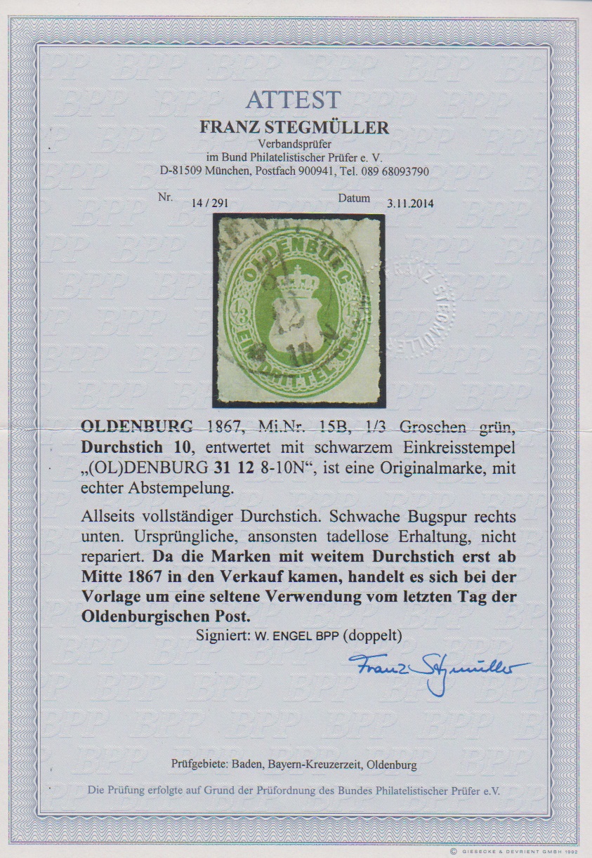 1/3 Gr. grün, guter weiter Durchstich "10", unten schwache Bugspur (von der Streifband-Verwendung) mit hierauf seltenem Letzttags-K2 "Oldenburg 31.12." (1867) in schwarz. Sign. Engel und Attest Stegmüller. Mi. 1000,- +