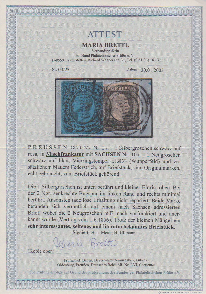 1 Sgr. schw./rosa in Mischfrankatur mit Sachsen Johann 2 Ngr. schw./blau auf Briefstück mit NS "1683" (Wupperfeld). Literaturbekanntes Briefstück (kleine Mängel), sign. Meier, Ullmann und Attest Brettl