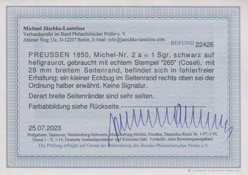1 Sgr. schw./rosa, Kabinettstück mit NS "265" (Cosel) und rechts extrem breitem Bogenrand (29mm). Fotoexp. Jäschke-L.: "Derart breite Seitenränder sind sehr selten."