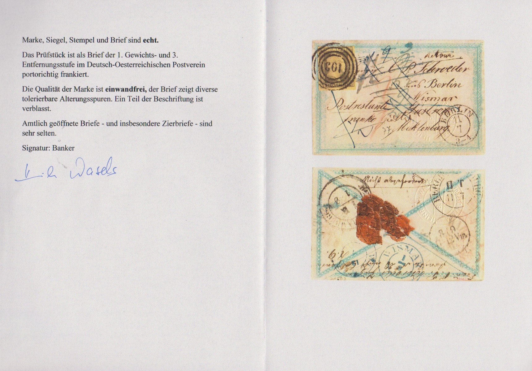 3 Sgr. schw./gelb, Kabinettstück auf entzückendem, lithographiertem Ziercouvert mit blau gedruckten Zierrändern, mit NS "103" und K2 "Berlin" nach Güstrow, weitergesandt nach Wismar und retour nach Berlin (rückseitig Eröffnungssiegel der OPD Berlin, typische Gebrauchsspuren). Ein sehr ungewöhnlicher und dekorativer Nachsende-Retour-Zierbrief aus der Kruschel-Sammlung. Attest Wasels