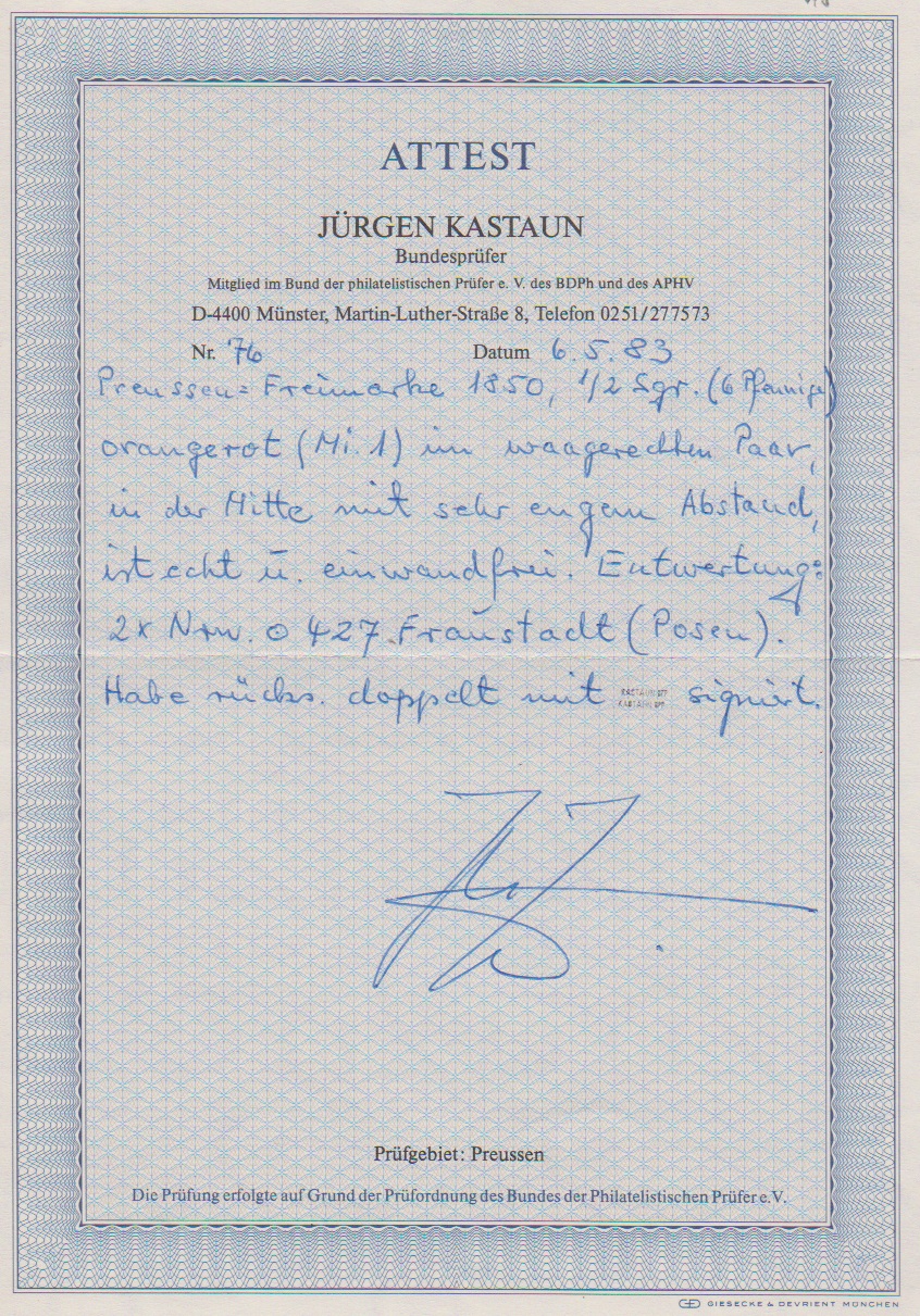 1 Sgr. schw./rosa, Luxusstück mit feinst zentrischem NS "1546" (Versmold), sign. Kastaun