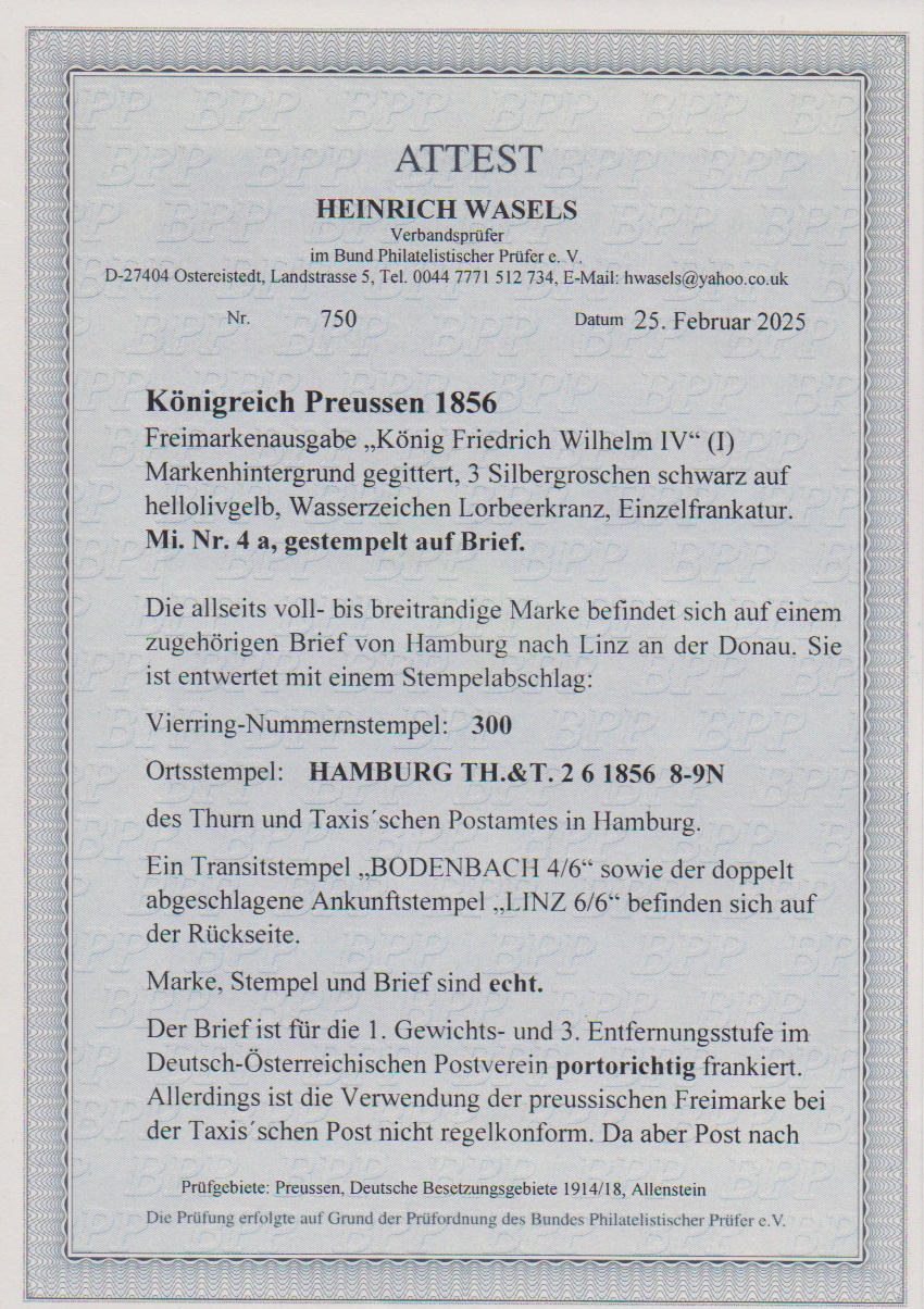 3 Sgr. schw./gelb, kl. behandelte Bugspur, mit sehr seltener Fremdentwertung durch taxischen Nummernstempel "300" (K1 "HAMBURG TH.&.T." als Nebenstempel) vom 2.6.1856 auf Brief nach Linz/Donau (Österreich), Attest Wasels