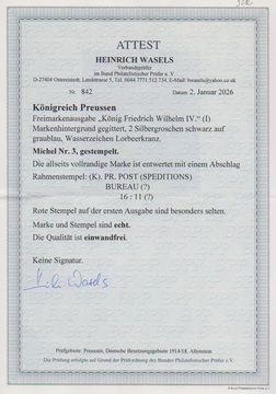 2 Sgr. schw./blau, Kabinettstück mit hierauf seltener Entwertung durch roten Bahnpost-Speditions-Ra3, Attest Wasels: "Rote Stempel auf der ersten Ausgabe sind besonders selten".
